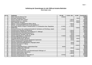 Seite 1 Aufteilung der Zuwendungen im Jahr 2009 auf einzelne Behörden (berichtigte Liste) lfd. Nr. Institution STA SB LG SB + AGe AG SB Zuwendungen 1 Aktion Arbeit des Bistums Trier 2.608,00 2.608,00 2 * Amnestie International, Bonn 700,00 700,00 3 Ärzte für die Dritte Welt, Frankfurt 1.200,00 1.200,00 4 * Arbeiterwohlfahrt e.V., Homburg 4.800,00 850,00 5.650,00 5 BAG Selbsthilfe, Düsseldorf 630,00 630,00 6 Balance, Verein für pädagogisches Reiten, Merzig 1.200,00 1.200,00 7 Blinden- und Sehbehindertenverein für das Saarland e.V. 350,00 350,00 8 Bund gegen Alkohol u.Drogen im Straßenverkehr e.V.Landessektion Saar, Riegelsberg 8.100,00 17.758,50 25.858,50 9 * BUND Saar 1.250,00 1.250,00 10 Caritaseinrichtung in der Landesaufnahmestelle für Vertriebene und Flüchtlinge, Lebach 2.700,00 2.700,00 11 * Caritaszentraum Saarpfalz-Suchtberatung 1.500,00 1.500,00 12 * Caritasverband für Saarbrücken und Umgebung e.V., Völklingen 1.550,00 1.550,00 13 Caritasverband Saar-Hochwald Saarlouis e.V. 750,00 750,00 14 * Caritasverband St. Wendeler Tafel, St. Wendel 100,00 100,00 15 Chance Jugendarbeit e.V., Saarbrücken 4.150,00 2.850,00 1.310,00 8.310,00 16 Christliche Bürgerhilfe Beckingen e.V. 1.000,00 1.000,00 17 Christoffel Blindenmission, Bensheim 350,00 400,00 750,00 18 DMSG Deutsche Multiple-Sklerose Gesellschaft, Saarbrücken 400,00 400,00 19 * Deutsch-Ausländischer Jugendclub DAJC 400,00 400,00 20 * Deutsche Lebensrettungsgesellschaft, Ortsgruppe Lebach 150,00 150,00 21 Deutsche Herzwacht e.V., Merzig 100,00 100,00 22 Deutsche Krebshilfe 3.000,00 3.000,00 23 Deutsche Kriegsgräberfürsorge, Landesverband Saar 850,00 850,00 24 Deutsche Luftrettung AG, Filderstadt 200,00 200,00 25 * Deutsche Tibethilfe, Hamburg 2.400,00 2.400,00 26 * Deutsche Verkehrswacht Kreis- und Ortsverkehrswacht Völklingen e.V. 1.050,00 1.050,00 27 Deutsche Verkehrswacht, Neunkirchen 500,00 500,00 28 Deutsche Welthungerhilfe, Bonn 3.400,00 3.400,00 29 Deutscher Kinderschutzbund Untere Saar e.V. 3.276,00 3.276,00 30 Deutsches Kinderhilfswerk e.V., Berlin 150,00 150,00