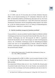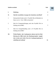 -3- Inhaltsverzeichnis Seite I. Einleitung 4 II. Sind die wesentlichen Aussagen des Gutachtens zutreffend? 4 1. Sind psychisch Kranke nach § 1 PsychKG Bln als Behinderte im Sinne von Art. 1 Abs. 2 BRK zu beurteilen? 4 2. Steht die Zwangsunterbringung nach dem PsychKG Bln im Einklang mit der BRK? 7 3. Steht die Zwangsbehandlung nach § 30 PsychKG Bln im Einklang mit der BRK? III. Welche Bundes- oder Landesgesetze müssen nach der Rati- fizierung der BRK durch den Bundesgesetzgeber angegli- chen werden und welche Form der Landesgesetzgebung ist zukünftig noch zulässig? 16