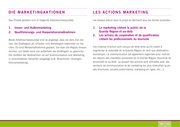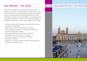 DAS PRO J EKT – D i e Z i e l e kulturst ä tten | L E S R E N C O N Die Ziele des Projektes sind darauf ausgerichtet, gemeinsame Aktionen zu entwickeln. Die Besonderheit des Projektes ist es, dass erstmals Maßnahmen in einer grenzüberschreitenden Expertengrup- pe, die mit den jeweiligen Tourismusverantwortlichen der Länder oder Regionen besetzt ist, erarbeitet werden. Zur Unterstützung und Umsetzung der Maßnahmen wurde als Teil des Gesamtprojektes ein Projektbüro implementiert. Hierbei werden folgende Ziele verfolgt: • Erstmals ein gemeinsames strategisch ausgerichtetes Tourismus- marketing für die Großregion • Entwicklung von innovativen Maßnahmen im Bereich Kommunikation zum Beispiel mit zeitgemäßen Informations- und Kommunikationstechnologien • Stärkung der Bekanntheit der Großregion als Reiseziel • Verstärkung des Binnentourismus in der Region • Nutzung des endogenen Potentials und des bereits vorhandenen Angebotes • Schaffung von regionalen Effekten (zusätzliche Wertschöpfung) insbesondere im tertiären Sektor
