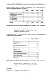 Drucksache 15/1484 (15/1329) Landtag des Saarlandes - 15. Wahlperiode - Wie viele Stammdatenabfragen sind in den Jahren 2005 bis 2008 von öffentlichen Stellen im Saar- land durchgeführt worden? (Bitte die Zahl der Ab- fragen nach den jeweiligen öffentlichen Stellen ge- trennt aufführen.) Zu Frage 3: Die Frage kann aus nachfolgenden Gründen nicht vollständig beantwortet werden: Arbeitsagenturen/Jobcenter, Sozialbehörden, BaFöG-Ämter und Wohngeld- stellen Für diese Stellen wurde durch das Unternehmensteuerreformgesetz 2008 vom 14.8.2007, BGBl I 2007, 1912, § 93 Abs. 8 AO neu gefasst, so dass erst ab Inkrafttre- ten der Regelung am 18.08.2007 ein Kontenabrufverfahren für obige Stellen ermög- licht wurde. Für die Zeiträume 2005 und 2006 können daher keine Daten geliefert werden, da ein Kontenabrufverfahren noch nicht möglich war. Auch für 2007 ist keine Datenlieferung möglich, da § 24 c Abs. 4 KWG regelt, dass die BaFin zwar die Daten zu Abrufen der einzelnen Behörden zu protokollieren und diese mindestens 18 Monate aufzubewahren hat, gleichwohl spätestens nach 2 Jahren diese zu löschen sind (§ 24 c Abs. 4 S. 3 KWG). Ab dem Jahre 2008 werden vom BZSt monatlich die bei der BaFin gespeicherten Da- ten zu Abfragen der Finanzämter, der Arbeitsagenturen/Jobcenter, der Sozialbehör- den, der BaFöG-Ämter sowie der Wohngeldstellen an das MFE geliefert und können daher mitgeteilt werden. Finanzämter Für die Finanzämter konnten die Zahlen der Kontoabrufe nach § 93 Abs. 7 AO ermit- telt werden, da auf Weisung des Bundesministeriums der Finanzen –BMF- die Finanz- ämter ab Mai 2005 bis April 2011 manuelle Aufzeichnungen über die Anzahl der Kon- tenabrufe zu führen hatten und verpflichtet waren, diese Daten auch quartalsweise an das Ministerium für Finanzen und Europa – MFE - zwecks Weiterleitung an das BMF zu melden. Anhand dieser Meldungen war es möglich, konkrete Zahlen über Anfragen der Finanzämter in den Jahren 2005 (jedoch erst ab Mai 2005) bis 2008 zu liefern. Polizeibehörden Eine Abfrage beim BZSt hinsichtlich der nach § 24 c Abs. 4 KWG durch die BaFin ge- speicherten Daten ist wegen der mittlerweile für die Jahre 2005-2008 erfolgten Lö- schung der Daten (§ 24c Abs. 4 S. 3 KWG) nicht mehr möglich. -5-