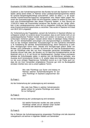 Drucksache 15/1036 (15/968) Landtag des Saarlandes - 15. Wahlperiode - Im Rahmen der letzten Innenministerkonferenz wurde zwischen dem Bund und den Ländern ver- einbart, dass die Länder die Kosten für die Kran- kenversicherung übernehmen. Gilt dies nur für Kontingente, die neu aufgelegt werden oder wird die Landesregierung die geplan- te Regelung auch auf die freien Plätze des zur Zeit bestehenden Landesprogramms anwenden? Zu Frage 8: Der von den Innenministern/ und -senatoren des Bundes und der Länder vereinbarte Verzicht auf Krankenversicherungsschutz gilt für die freien Plätze im saarländischen Aufnahmeprogramm. Im Übrigen wird auf die Vorbemerkung der Landesregierung verwiesen. -5-