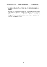 Drucksache 16/1763 Landtag des Saarlandes - 16. Wahlperiode - 3. Wie stellt die Landesregierung sicher, dass Lehrkräfte, die andere digitale Lernplattformen als die Online-Schule Saarland nutzen, ebenso geschult werden? 4. Wie stellt die Landesregierung sicher, dass an saarländischen Schulen aus- schließlich solche digitalen Lernplattformen im Einsatz sind, bei denen ein Schutz der persönlichen Daten der Schülerinnen, Schüler und Lehrkräfte si- chergestellt ist und keine offene oder verdeckte Werbung durch Unterneh- men oder Lobbygruppen erfolgt? -2-