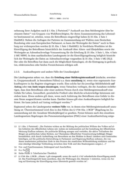 Ausarbeitung Wissenschaftliche Dienste Seite 8 WD 3 – 3000 – 211/12 13 nehmung ihrer Aufgaben nach § 1 Abs. 2 ParteienG Auskunft aus dem Melderegister über be- 14 stimmte Daten von Gruppen von Wahlberechtigten, für deren Zusammensetzung das Lebensal- ter bestimmend ist, erteilen, wenn die Betroffenen eingewilligt haben (§ 35 Abs. 2 Satz 1 HmbMG). Stehen die Anfragen der Parteien im Zusammenhang mit Wahlen zum Deutschen 15 Bundestag oder zum Europäischen Parlament, so kann der Weitergabe der Daten auch in Ham- burg nur widersprochen werden (§ 35 Abs. 1 Satz 1 HmbMG). In Nordrhein-Westfalen ist die Einwilligung der Betroffenen hinsichtlich der Auskunft über Alters- und Ehejubiläen sowie der Weitergabe an Adressbuchverlage Voraussetzung für die Erteilung (§ 35 Abs. 3 Satz 1, Abs. 4 Satz 2 MG NRW). In dem saarländischen Landesgesetz ist die Einwilligungslösung lediglich hinsicht- lich der Weitergabe der Daten an Adressbuchverlage vorgesehen (§ 35 Abs. 3 Satz 1 MG (SL)). Der oder die Betroffene hat dann auch die Möglichkeit festzulegen, ob die Eintragung in gedruck- ten, elektronischen oder beiden Verzeichnissen erfolgen soll. 2.3.5. Auskunftssperre und andere Fälle der Unzulässigkeit Die Ländergesetze sehen vor, dass die Erteilung einer Melderegisterauskunft (einfache, erweiter- te, Gruppenauskunft, in besonderen Fällen) u.a. dann unzulässig ist, wenn eine sogenannte Aus- kunftssperre in das Register eingetragen wurde. Eine solche hat die jeweilige Meldebehörde auf Antrag oder von Amts wegen einzutragen, wenn Tatsachen vorliegen, die die Annahme rechtfer- tigen, dass dem Betroffenen oder einer anderen Person durch eine Melderegisterauskunft eine Gefahr für Leben, Gesundheit, persönliche Freiheit oder ähnliche schutzwürdige Interessen ent- stehen kann. Etwas anderes gilt dann, wenn nach Anhörung des Betroffenen eine Gefahr in die- sem Sinne ausgeschlossen werden kann. Darüber hinaus gilt eine Auskunftssperre lediglich be- 16 fristet. Sie kann jedoch auf Antrag verlängert werden. Ergänzend sehen die Ländergesetze weitere Fälle vor, in denen eine Melderegisterauskunft unzu- 17 lässig ist. Übereinstimmend wird dies in den Fällen des § 1758 Abs. 2 BGB (Regelung im Zu- sammenhang mit der Annahme Minderjähriger) so gesehen. Ferner können nach den einzelnen Landesgesetzen Regelungen des Personenstandsgesetzes (PStG) einer Auskunftserteilung entge- 13 § 1 Abs. 2 ParteienG: „Die Parteien wirken an der Bildung des politischen Willens des Volkes auf al- len Gebieten des öffentlichen Lebens mit, indem sie insbesondere auf die Gestaltung der öffentlichen Meinung Einfluss nehmen, die politische Bildung anregen und vertiefen, die aktive Teilnahme der Bürger am politischen Leben fördern, zur Übernahme öffentlicher Verantwortung befähigte Bürger heranbilden, sich durch Aufstellung von Bewerbern an den Wahlen in Bund, Ländern und Gemeinden beteiligen, auf die politische Entwicklung in Parlament und Regierung Einfluss nehmen, die von ihnen erarbeiteten politischen Ziele in den Prozess der staatlichen Willensbildung einführen und für eine ständige lebendige Verbindung zwischen dem Volk und den Staatsorganen sorgen.[…]“ 14 Vor- und Familiennamen, Doktorgrad und Anschriften. 15 S.o. Fn. 14 16 Siehe Punkt 3: Tabellarischer Überblick 17 § 1758 Abs. 2 BGB: „Absatz 1 gilt sinngemäß, wenn die nach § 1747 erforderliche Einwilligung erteilt ist. Das Familiengericht kann anordnen, dass die Wirkungen des Absatzes 1 eintreten, wenn ein An- trag auf Ersetzung der Einwilligung eines Elternteils gestellt worden ist“.