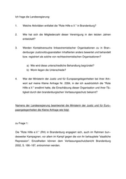 Landtag Brandenburg Drucksache 3/6609 3. Wahlperiode Antwort der Landesregierung auf die Kleine Anfrage Nr. 2475 des Abgeordneten Sigmar−Peter Schuldt Fraktion der DVU Drucksache 3/6488 Linksextremistische Organisation "Rote Hilfe e.V." Wortlaut der Kleinen Anfrage Nr. 2475 vom 1. Oktober 2003: In der Antwort auf meine Kleine Anfrage Nr. 2284 (Drs. 3/6166) teilt die Ministerin der Justiz und für Europaangelegenheiten mit, der Landesregierung seien keine Bestrebungen linksextremistischer Gruppierungen zur Kontaktaufnahme mit in Brandenburger Justizvollzugsanstalten Inhaftierten bekannt. Die Abteilung "Verfassungsschutz" beim Ministerium des Innern teilt hingegen im Rahmen ihres Internetauftrittes mit, die "Rote Hilfe e.V." gehöre zu den erwäh− nenswerten sonstigen linksextremistischen Vereinigungen im Land Brandenburg. Die "Rote Hilfe e.V." wird vom brandenburgischen Verfassungsschutz folgender− maßen beschrieben: "Der Vereinigung "Rote Hilfe e.V." (RH) gehören Linksextre− misten unterschiedlicher Richtungen an. Die RH unterstützt als "Schutz− und Soli− daritätsorganisation" Linksextremisten, die sich vor Gericht verantworten müssen bzw. Haftstrafen verbüßen." Datum des Eingangs: 05.11.2003 / Ausgegeben: 11.11.2003