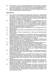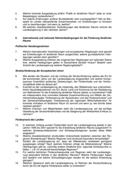 Namens der Landesregierung beantwortet der Minister für Landwirtschaft, Umweltschutz und Raumordnung die Fragen wie folgt: I. Ziel der Entwicklung ländlicher Räume zu Frage 1: Nach welchen Kriterien werden ländliche Räume zu anders geprägten Gebieten abgegrenzt? zu Frage 2: Verfolgt die Landesregierung eine spezielle "Politik für den ländlichen Raum"? Wodurch ist diese gekennzeichnet? zu Frage 3: Welche Regionen Brandenburgs sind besonders strukturschwach und förderbedürftig, worin werden die Hauptursachen gesehen? Die Abgrenzung der Gebietskategorie "ländliche Räume" erfolgt in den Bundesländern durch die Landesplanung, meist im Rahmen der Landesraumordnungspläne. Die Kriterien für die Abgrenzung werden zwischen den Bundesländern abgestimmt und folgen dabei stets einer Definition dahingehend, dass "ländliche Räume" alle die Räume sind, die nicht "Verdichtungs− oder Ordnungsräume" sind. Da sich die Siedlungsstruktur in den neuen Ländern hinsichtlich der Mindestgrößen von "Verdichtungsräumen" von der Situation in den alten Ländern deutlich unterscheidet, sind neben dem − durch Beschluss des Hauptausschusses der Ministerkonferenz für Raum− ordnung (MKRO) vom 07.09.1993 festgelegten − Verdichtungsraum Berlin (der u.a. die Landeshauptstadt Potsdam und die verdichteten Gemeinden entlang der S−Bahn−Radia− len beinhaltet) auch die Oberzentren Cottbus, Brandenburg. und Frankfurt (Oder) im Ent− wurf des Landesentwicklungsplanes für den Gesamtraum Berlin−Brandenburg (LEP GR) vom 27.02.2001 als "Verdichtete städtische Räume" benannt worden und zählen daher nicht zu den ländlichen Räumen. Die übrigen Gebiete − und damit der größte Teil des Landes Brandenburg − werden als "ländliche Räume" bezeichnet. Unter Beachtung des hohen Stellenwertes der ländlichen Räume haben Maßnahmen der ländlichen Entwicklung eine hohe Priorität bei den Maßnahmen der Landesregierung zur Unterstützung der Landesentwicklung. Die Politik der Landesregierung ist dadurch ge− kennzeichnet, dass unter Federführung des Ministers für Landwirtschaft, Umweltschutz und Raumordnung durch die Ämter für Flurneuordnung und ländliche Entwicklung mit den Landkreisen und kreisfreien Städten sowie den Ämtern regionale Schwerpunkte der Ent− wicklung bestimmt wurden. Über die Koordinierungsgremien bei den Ämtern für Flurneu− ordnung und ländliche Entwicklung soll eine übergreifende und zeitlich abgestimmte Maßnahmenumsetzung gesichert werden. Besonders strukturschwach und förderbedürftig sind die zentrenfernen Regionen des Nordwestens (Prignitz), des Nordostens (Uckermark) sowie des südlichen Brandenburgs (Lausitz). Ursachen der Strukturschwäche und hohen Förderbedürftigkeit liegen in dem Abbau von Arbeitsplätzen im Bereich der Landwirtschaft und der mit der Landwirtschaft verbundenen Einkommensbereiche sowie in den gravierenden strukturellen Veränderun− gen in der Industrie und der Ressourcenerschließung (Braunkohle, Energieversorgung). zu Frage 4: Welche konkrete Ausgestaltung erfährt "Politik im ländlichen Raum" (bitte an einer Beispielregion verdeutlichen)? Die Politik für die ländlichen Räume erfährt ihre Ausgestaltung zum einen durch die ziel− gerichtete Ausrichtung der Instrumentarien der Landentwicklung, zum anderen durch den befördernden Dialog mit den Akteuren (Bürgerinnen und Bürgern, Gemeinden, Landkrei− sen, Nichtregierungsorganisationen) in der Region. Als Beispiel kann der Spreewald dienen. Hier wurden in den Ämtern und Gemeinden kommunale und private Maßnahmen der ländlichen Entwicklung gezielt umgesetzt und damit die Arbeits− und Lebensbedingungen in den ländlichen Gemeinden nachhaltig ver− bessert. Gleichzeitig haben Akteure aus der Region (auch unterstützt durch die Gemein−