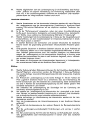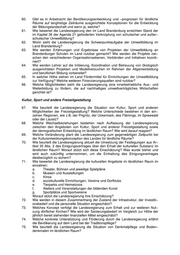 60. Gibt es in Anbetracht der Bevölkerungsentwicklung und −prognosen für ländliche Räume auf langfristige Zeiträume ausgerichtete Konzeptionen für die Entwicklung der Bildungslandschaft und wenn ja, welche? 61. Wie bewertet die Landesregierung den im Land Brandenburg erreichten Stand der im Kapitel 36 der Agenda 21 geforderten Verknüpfung von schulischer und außer− schulischer Umweltbildung? 62. Worin sieht die Landesregierung die Schwerpunktaufgabe der Umweltbildung im Land Brandenburg? 63. Wie werden Erfahrungen und Ergebnisse von Projekten der Umweltbildung an Brandenburger Schulen im Land nutzbar gemacht? Wie werden die Projekte zwi− schen den verschiedenen Organisationsebenen, Verbänden und Initiativen koordi− niert? 64. Wie werden Lehrer auf die Initiierung, Koordination und Betreuung von ökologisch ausgerichteten Projekten und Modellversuchen im Rahmen der Allgemeinbildung und beruflichen Bildung vorbereitet? 65. In welcher Höhe stehen im Land Fördermittel für Einrichtungen der Umweltbildung zur Verfügung? Welche weiteren Finanzierungsquellen sind nutzbar? 66. Welche Möglichkeiten sieht die Landesregierung eine innerbetriebliche Aus− und Weiterbildung zu fördern, die auf nachhaltiges umweltverträgliches Wirtschaften gerichtet ist? Kultur, Sport und andere Freizeitgestaltung 67. Wie beurteilt die Landesregierung die Situation von Kultur, Sport und anderen Möglichkeiten der Freizeitgestaltung? Welche Unterschiede bestehen in den ein− zelnen Regionen, wie z.B. der Prignitz, der Uckermark, des Flämings, im Spreewald oder der Lausitz? 68. Welche Wechselbeziehungen bestehen nach Auffassung der Landesregierung zwischen den Angeboten von Kultur, Sport und anderer Freizeitgestaltung sowie der demografischen Entwicklung im ländlichen Raum? Wie wird darauf reagiert? 69. Welche Veränderung plant die Landesregierung zum gegenwärtigen Zeitpunkt bei der Kulturentwicklungskonzeption des Landes für ländliche Räume? 70. Wie beurteilt die Landesregierung aktuell die Umsetzung der Festlegungen aus Ar− tikel 35 Abs. 2 des Einigungsvertrages über den Erhalt der kulturellen Substanz im ländlichen Raum? Worauf stützt sich diese Einschätzung? Was wurde bisher und wird auch zukünftig unternommen, um die Einhaltung des Einigungsvertrages diesbezüglich zu sichern? 71. Wie bewertet die Landesregierung die kulturellen Angebote im ländlichen Raum im einzelnen: a. Theater, Bühnen und jeweilige Spielpläne b. Museen und Ausstellungen c. Kinos d. soziokulturelle Einrichtungen, Vereine und Dorfklubs e. Tierparks und Heimatzoos f. Ateliers und Veranstaltungen der bildenden Kunst g. Sportplätze und Sportvereine Worauf stützt die Landesregierung ihre Einschätzung? 72. Wie werden in diesem Zusammenhang der Zustand der Infrastruktur, der Investiti− onsbedarf und die personelle Situation eingeschätzt? 73. Welches Konzept verfolgt die Landesregierung zum Erhalt und zur weiteren Nut− zung dörflicher Kirchen? Wie wird der Sanierungsbedarf im Vergleich zur Höhe der jährlich bereit stehenden finanziellen Mittel eingeschätzt? 74. Welche konkrete Unterstützung und Förderung durch die Landesregierung erfährt die Bevölkerung auf dem Land bei der Traditionspflege? 75. Wie beurteilt die Landesregierung die Situation von Denkmalpflege und Boden− denkmalen im ländlichen Raum?