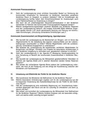 Kommunale Finanzausstattung 91. Sieht die Landesregierung einen erhöhten finanziellen Bedarf zur Sicherung der kommunalen Infrastruktur für Gemeinden im ländlichen, besonders peripheren ländlichen Raum im Vergleich zu anderen Gebieten? Gibt es Vorstellungen der Landesregierung künftig neben dem Einwohnerschlüssel für Zuweisungen auch einen Flächenschlüssel zur Anwendung zu bringen? 92. Wie kann der oft unbefriedigenden Steuereinnahmesituation in den ländlichen Gemeinden im Rahmen des kommunalen Finanzausgleichs begegnet werden? 93. Welche verallgemeinerungswürdigen positiven Beispiele aus ländlichen Regionen sind der Landesregierung bekannt, wie knappe finanzielle Mittel effektiver einge− setzt werden können (z.B. durch gemeinsame Nutzung und Planung von kommu− nalen Einrichtungen, Umnutzung vorhandener Einrichtungen usw.)? Kommunale Zusammenarbeit und Bürgerbeteiligung, Agendaprozess 94. Wie beurteilt die Landesregierung die Bereitschaft von Bürgern, sich im Sinne des Allgemeinwohls für die Gestaltung des eigenen Lebensumfelds und der Lebens− bedingungen verantwortlich zu fühlen? Welche Möglichkeiten sieht die Landesre− gierung, vorhandenes Engagement zu unterstützen? 95. Wie bewertet die Landsregierung die bestehenden rechtlichen Möglichkeiten für Bürgerinnen und Bürger, Vorhaben und Projekte mit besonderen Auswirkungen in ihrer ländlichen Umgebung zu verhindern bzw. gestalterisch mitwirken zu können? 96. Sieht die Landesregierung in der Agenda−21−Bewegung Handlungsansätze für eine Vernetzung im Bereich der kommunalen Zusammenarbeit in ländlichen Räu− men? 97. Wie beurteilt die Landesregierung die Wirksamkeit gesellschaftlicher Aktivitäten im Rahmen der Agenda−Arbeit und in welchen Bereichen werden hierbei Reserven gesehen? 98. Wie werden die vorhandenen Agenda−Büros seitens der Landesregierung unter− stützt, wie hoch ist die Förderung und wie erfolgt die Koordinierung zwischen den Ministerien und Fachressorts? VI. Umsetzung und Effektivität der Politik für die ländlichen Räume 99. Wie koordinieren die Ministerien die Maßnahmen für die ländlichen Räume? 100. Welche besonderen Anforderungen ergeben sich für die Landesregierung aus der konsequenten Anwendung des Subsidiaritätsprinzips bei der Politik für den ländli− chen Raum? 101. Hält die Landesregierung eine veränderte Abgrenzung von Verantwortung insbe− sondere gegenüber dem Bund und der EU zukünftig für erforderlich und wenn ja, warum und wie? 102. Wie erfasst und kontrolliert die Landesregierung die Wirksamkeit ihrer Maßnahmen für die ländlichen Regionen? Welche Ansätze erwiesen sich als besonders erfolg− reich und welche sollen zukünftig korrigiert werden?