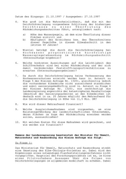 Landtag Brandenburg Drucksache 2/4609 2. Wahlperiode Antwort der Landesregierung auf die Kleine Anfrage 1453 der Abgeordneten Rainer Neumann und Joachim Stöcker Fraktion der CDU Drucksache 2/4402 Deichrückverlegung Wortlaut der Kleinen Anfrage Nr. 1453 vom 29.08.1997: Obwohl im Zuge der Untersuchungen zur Deichrückverlegung im Bereich Lenzen-Wustrow bisher nur das hydraulisch-morphologische Gutachten vorliegt und Ergebnisse der Untersuchungen zur Dränge- und Grundwasserproblematik (s. Kleine Anfrage Nr. 1320) sowie des Forschungsprojektes der Naturparkverwaltung, das die Auswirkungen der Deichrückverlegung auf die Stadt Lenzen klären soll (s. "MAZ" vom 16. 04. 1997), noch ausstehen, verkündete der Umweltminister des Landes Brandenburg bereits in der Presse, daß das Naturschutzprojekt Deichverlegung verwirklicht wird (s. "Der Prignitzer" vom 10. 06. 1997). Ich frage die Landesregierung: 1. Warum hat der Umweltminister des Landes Brandenburg bereits eine positive Entscheidung zur o. g. Deichrückverlegung getroffen und bekanntgegeben, obwohl z. B. die ersten Untersuchungsergebnisse des Forschungsprojektes, das die Auswirkungen der Deichrückverlegung auf die Stadt Lenzen klären soll (Gesamtlaufzeit: bis 1998), erst im Laufe des Jahres 1997 vorliegen werden (s. "MAZ" vom 16. 04. 1997)? 2. Wie begründet die Landesregierung diese Entscheidung? 3. Welche Kosten werden durch das Forschungsprojekt, das die Auswirkungen der Deichrückverlegung auf die Stadt Lenzen klären soll (s. Frage 1), insgesamt verursacht, und wie werden sie finanziert?