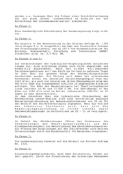 werden u.a. Aussagen über die Folgen einer Deichrückverlegung für die Stadt Lenzen -insbesondere im Hinblick auf die Entwicklung der Grundwassersituation- erarbeitet. Zu Frage 2: Eine diesbezügliche Entscheidung der Landesregierung liegt nicht vor. Zu Frage 3: Wie bereits in der Beantwortung zu der Kleinen Anfrage Nr. 1320 (hier Fragen 2 u. 3) ausgeführt, beträgt das finanzielle Volumen des Forschungsprojektes, das zu 100 % vom Bundesministerium für Bildung, Wissenschaft, Forschung und Technologie (BMBF) finanziert wird, ca. 3,5 Mio. DM. Zu Fragen 4 und 5: Die Untersuchungen des hydraulisch-morphologischen Gutachtens liegen vor, sind allerdings bisher noch nicht abgestimmt und endgültig abgenommen. Nach den bisher vorliegenden Zwischenergebnissen soll das künftige Vorland an mehreren Tagen im Jahr über die gesamte Länge der Rückdeichungsstrecke durchströmt werden. Die Füllung soll dabei bei anlaufendem Hochwasser sowohl von oberstrom (Einströmungsbeginn etwa bei 3 1200 m /s), als auch von unterstrom (Einströmungsbeginn etwa bei 3 900 m /s) über die vorgesehenen Schlitze im abgesenkten Altdeich erfolgen. Die Höhe des Wasserspiegels bei Überflutungsbeginn liegt zwischen 16.40 und 17.00m ü NN. Die Abflußmenge in der 3 Elbe von 1200 m /s wird im Mittel (Jahresreihe 1940/91) an 47 Tagen im Jahr überschritten. In dem Gutachten über die hydraulische Untersuchung der Rückdeichung Lenzen-Wustrow wird eine kurzfristige maximale Wasserspiegelabsenkung bei Bemessungshochwasser von 58 cm für den Bereich der Deichrückverlegung angegeben. Wenn das Vorland der Sukzession überlassen wird, kann sich die Wasserspiegelabsenkung in ferner Zukunft durch Sedimentablagerungen im Deichvorland um 20 - 25 cm verringern. Zu Frage 6: Im Umfeld der Rückdeichungen führen bei Hochwasser die Veränderungen des Wasserspiegelgefälles und der Fließgeschwindigkeit zur Beeinflussung des Geschiebetransportes. Zur Prüfung der Auswirkungen auf den Schiffverkehr sind weitere Untersuchungen durch die Bundesanstalt für Wasserbau vorgesehen. Zu Frage 7: Die Landesregierung verweist auf die Antwort zur Kleinen Anfrage Nr. 1320. Zu Frage 8: Finanzierungsmöglichkeiten, auch über Drittmittel, werden zur Zeit geprüft. Durch die Finanzierung der bisherigen Maßnahmen