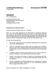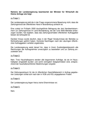 Landtag Brandenburg Drucksache 3/5106 3. Wahlperiode Antwort der Landesregierung auf die Kleine Anfrage 1905 der Abgeordneten Liane Hesselbarth Fraktion der DVU Landtagsdrucksache 3/4969 Brandenburg als säumiger Zahler? Wortlaut der Kleinen Anfrage 1905 vom 17.10.2002: Wenn es um die rasche Begleichung von Rechnungen für erbrachte Leistungen geht, nimmt sich die öffentliche Hand oftmals viel Zeit. Vor allem beschweren sich die Handwerker, dass der Staat die Rechnungen viel später als Private bezahlt. Mit dieser Verhaltensweise wird vor allem den mittelständischen Unternehmen Liquidität entzogen. Banken und Sparkassen halten sich bei der Kreditvergabe zurück. Ich frage die Landesregierung: 1. Wie will die Landesregierung die schlechte Zahlungsmoral der öffentlichen Hand in den Griff bekommen? 2. Sieht die Landesregierung die Gefahr, dass sich aufgrund der Haushalts− sperre im Land und in zahlreichen Kommunen die Zahlungsmoral noch weiter verschlechtert und somit mittelständische Unternehmen in den Ruin getrieben werden? 3. In welchem Zeitraum werden durchschnittlich die vom Land in Auftrag ge− gebenen Leistungen an die ausführenden Unternehmen bezahlt? 4. Wurden in den letzten fünf Jahren von Seiten der Leistungserbringer Maß− nahmen zur Eintreibung von offenen Rechnungsbeträgen gegen das Land durchgeführt? 5. Sind der Landesregierung derartige Maßnahmen zur Eintreibung von offenen Rechnungsbeträgen gegen Kommunen im Land Brandenburg bekannt? Wenn ja, gegen welche Kommunen? Datum des Eingangs: 25.11.2002 / Ausgegeben: 02.12.2002