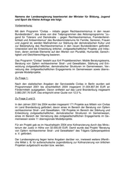 Landtag Brandenburg Drucksache 4/875 4. Wahlperiode Antwort der Landesregierung auf die Kleine Anfrage 292 der Abgeordneten Barbara Richstein Fraktion der CDU Drucksache 4/647 Einstellung des Programms "civitas" Wortlaut der Kleinen Anfrage Nr. 292 vom 15.02.2005: Über das Bundesprogramm "civitas − initiativ gegen Rechtsextremismus in den neuen Bundesländern" sollen den neuen Ländern bis 2006 49 Mio. Euro zur Ver− fügung gestellt werden. Weitere Mittel werden seitens der Länder bereitgestellt. Aussagen zur Effizienz des Programms sollten Ende 2004 getroffen werden. Vor wenigen Tagen wurde in den Medien verkündet, dass die Gegenfinanzierung sei− tens des Landes gekürzt werden soll. Trotz zunehmender Fremdenfeindlichkeit würde es somit zu Einschnitten vor allem in der Opferbetreuung kommen. Ich frage die Landesregierung: 1. Wie hoch ist die Gesamtsumme der Bundesmittel, die Brandenburg im Rahmen dieses Programms erhält? 2. In welcher Höhe wurden bislang Landesmittel zur Gegenfinanzierung einge− setzt? 3. Welche Projekte wurden mit diesem Geld finanziert? 4. Wurden die Projekte evaluiert und wie erfolgreich waren sie nach Auffassung der Landesregierung? 5. In welcher Höhe wird dieses Programm in den nächsten zwei Jahren gegen− finanziert? 6. Wie wird die Opferbetreuung künftig gewährleistet? Datum des Eingangs: 04.04.2005 / Ausgegeben: 11.04.2005