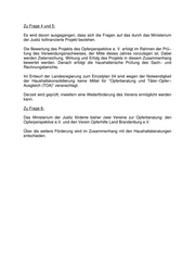Zu Frage 4 und 5: Es wird davon ausgegangen, dass sich die Fragen auf das durch das Ministerium der Justiz kofinanzierte Projekt beziehen. Die Bewertung des Projekts des Opferperspektive e. V. erfolgt im Rahmen der Prü− fung des Verwendungsnachweises, der Mitte dieses Jahres vorzulegen ist. Dabei werden Zielerreichung, Wirkung und Erfolg des Projekts in diesem Zusammenhang bewertet werden. Danach erfolgt die haushalterische Prüfung des Sach− und Rechnungsberichts. Im Entwurf der Landesregierung zum Einzelplan 04 sind wegen der Notwendigkeit der Haushaltskonsolidierung keine Mittel für "Opferberatung und Täter−Opfer− Ausgleich (TOA)" veranschlagt. Derzeit wird geprüft, inwiefern eine Weiterförderung des Vereins ermöglicht werden kann. Zu Frage 6: Das Ministerium der Justiz förderte bisher zwei Vereine zur Opferberatung: den Opferperspektive e.V. und den Verein Opferhilfe Land Brandenburg e.V. Über die weitere Förderung wird im Zusammenhang mit den Haushaltsberatungen entschieden.