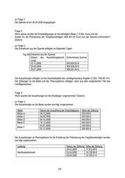 02.06.2008 162.805,38 € 01.08.2008 139.356,66 € Vorgaben für die zu rekonstruierende Fassade 13.10.2008 51.608,84 € 27.10.2008 510,51 € Modellbau 03.07.2008 595,00 € Frage 4: Welche exakten Endbestände hatten die Anlagen zum jeweilig angeführten Fälligkeitstag? Frage 5: Bei welchen Kreditinstituten und zu welchen Konditionen wurde die Spende jeweils angelegt? zu Frage 4 und zu Frage 5: Die folgende Tabelle stellt die Endbestände zum jeweiligen Fälligkeitstag, die beteiligten Kreditinstitute und die Konditionen, zu denen die Anlagen vorgenommen wurden, dar: angelegter Zinssatz Anlageart Valuta fällig am Zinsen (€) Gesamtbetrag(€) Bank Betrag (€) (%) Termingeld 04.04.08 02.05.08 20.000.000,00 59.952,49 20.059.952,49 3,85 Bankhaus Metzler Tagesgeld 02.05.08 05.05.08 20.000.000,00 6.666,67 20.006.666,67 4,00 Investitionsbank Land (*) Brandenburg Termingeld 05.05.08 01.07.08 600.000,00 4.417,50 604.417,50 4,65 Maple Bank Frankfurt am Main Termingeld 05.05.08 01.12.08 1.200.00,00 33.670,00 1.233.670,00 4,81 Bayerische Landes- bank Termingeld 05.05.08 05.05.09 18.266.619,16 909.347,82 19.175966,98 4,91 Investitonsbank Berlin Termingeld 02.07.08 21.07.08 504.417,50 1.104,81 505.522,31 4,15 Maple Bank Frankfurt am Main Termingeld 02.07.09 02.07.12 19.108.877,85 2.152.508,93 21.261.386,78 3,7 WestLB Düsseldorf (*)Tagesgeld, da 03. und 04.05.08 Wochenende - kein Bankarbeitstag Da Aufwendungen im Zusammenhang mit der präzisierten Aufgabenstellung sowie an die Bieter zeit- nah aus der Spende zu begleichen waren, wurden die Anlagebeträge zeitweilig gesplittet. Frage 6: Warum wurde die Spende – laut der Antwort auf die oben genannte Anfrage - in der Zeit vom 06. Mai 2009 bis zum 01. Juli 2009 nicht zins bringend angelegt? zu Frage 6: In dieser Zeit lief die letzte Phase des Wettbewerblichen Dialogs mit intensiven Verhandlungen mit den beiden im Verfahren verbliebenen Konsortien. Es war zu diesem Zeitpunkt noch offen, ob weitere Ver- fahrenskosten anfallen würden, bzw. für welchen Zeitraum die Spende längerfristig angelegt werden konnte. 3/4