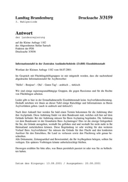Landtag Brandenburg Drucksache 3/3159 3. Wahlperiode Antwort der Landesregierung auf die Kleine Anfrage 1182 des Abgeordneten Stefan Sarrach Fraktion der PDS Drucksache 3/3036 Informationstafel in der Zentralen Ausländerbehörde (ZABH) Eisenhüttenstadt Wortlaut der Kleinen Anfrage 1182 vom 04.07.2001: Im Gespräch mit Flüchtlingshilfegruppen ist mir mitgeteilt worden, dass die nachstehend abgedruckte Informationstafel für Asylbewerber: "Hello! - Bonjour! - Ola! - Guten Tag! - arabisch ... türkisch Wir sind einige regierungsunabhängige Gruppen, die gegen Rassismus und für die Rechte von Flüchtlingen arbeiten. Leider gibt es hier in der Erstaufnahmestelle Eisenhüttenstadt keine Asylverfahrensberatung. Deshalb möchten wir ihnen an dieser Tafel einige Ratschläge und Informationen zu Ihrem Asylverfahren geben. (auch in arabisch und türkisch!) Nach ihrer Ankunft hier werden Sie bald einen Termin bekommen für die Anhörung über ihre Asylgründe. Diese Anhörung findet vor dem Bundesamt statt, welches sich hier auf dem Gelände befindet. Bei der Anhörung müssen Sie Ihren Asylantrag begründen. Die Anhörung vor dem Bundesamt ist der Grundstein Ihres Asylantrages! Dies ist die einzige Gelegenheit für Sie, die Gründe anzugeben, weshalb Sie geflohen sind und weshalb Sie nicht mehr in Ihr Heimatland zurückkehren können. Diese Begründung ist sehr wichtig für den weiteren Verlauf Ihres Asylverfahrens! Sie müssen die Gründe für ihre Flucht und den konkreten Auslöser für den Entschluss, Ihr Land zu verlassen sowie den Fluchtweg sehr genau be- schreiben. Alle Dokumente, Zeitungsartikel und Beweismittel, die Ihr Asylbegehren belegen, sollten Sie vorlegen. Ein späteres Vorbringen könnte unberücksichtigt bleiben. Deswegen erzählen Sie bitte alles, was Ihnen persönlich passiert ist oder was Sie zu befürch- ten haben. Datum des Eingangs: 13.08.2001 / Ausgegeben: 20.08.2001