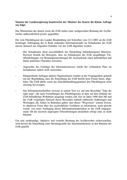 4 Namens der Landesregierung beantwortet der Minister des Innern die Kleine Anfrage wie folgt: Das Ministerium des Innern sowie die ZAB stehen einer sachgerechten Beratung der Asylbe- werber außerordentlich positiv gegenüber. Die vom Flüchtlingsrat des Landes Brandenburg mit Schreiben vom 23.3.2001 an die ZAB beantragte Anbringung der in Rede stehenden Informationstafel im Schaukasten der ZAB musste dennoch aus folgenden Gründen von der ZAB abgelehnt werden: - Der Schaukasten dient ausschließlich der Darstellung behördeneigener Hinweise. Insoweit besteht die Besorgnis, dass im Schaukasten der ZAB ausgehängte Ver- öffentlichungen von Beratungseinrichtungen für Asylsuchende einen behördlichen und damit amtlichen Charakter erwecken. - Angesichts des Umfangs des Informationstextes würde der vorhandene Platz im Schaukasten zudem nicht ausreichen. - Entsprechende Anfragen anderer Organisationen wurden in der Vergangenheit generell mit der Begründung, dass die Einrichtung der ZAB hierfür kein Forum bietet, abge- lehnt. Die ZAB dürfte somit aus Gleichbehandlungsgründen den Flüchtlingsrat nicht einseitig bevorzugen. - Das Informationsschreiben verweist in seinem Text u.a. auf eine Broschüre "Take the right steps", die nach Vorstellungen des Flüchtlingsrates in dem auf dem Gelände der ZAB befindlichen Wohnheim ausgelegt werden soll. Ein im Jahre 1998 dem MI und der ZAB vorgelegter Entwurf dieser Broschüre enthielt zahlreiche Äußerungen und Wertungen, die Anlass zu Bedenken gaben, dass dieser "Wegweiser" seinem Zweck, in objektiver Form über das asylrechtliche Verfahren zu informieren, nicht gerecht wurde, was einer Auslegung dieser Informationsmaterialien in der ZAB entgegen- stand. Ob die insoweit angeregten Überarbeitungen tatsächlich erfolgt sind, ist nicht bekannt. Um eine sachkundige, objektive und vertiefte Beratung der Asylbewerber sicherzustellen, wird derzeit die Einrichtung einer Beratungsstelle des Innenministeriums in den Räumen der ZAB geprüft.