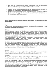 Landtag Brandenburg Drucksache 5/548 5. Wahlperiode Antwort der Landesregierung auf die Kleine Anfrage 139 der Abgeordneten Kerstin Kircheis SPD-Fraktion Drucksache 5/372 Wortlaut der Kleinen Anfrage 139 vom 02.02.2010: Gefährdung der Brandenburger ÖPNV-Qualität durch die Krise der Berliner S-Bahn Die S-Bahn Berlin GmbH gewährleistet seit Monaten nicht den vereinbarten Betrieb in Berlin und Brandenburg. Die Einschränkungen des Verkehrs haben die beiden betroffenen Länder zum Anlass genommen, die Finanzleistungen an die S-Bahn GmbH erheblich zu kürzen. Die S-Bahn Berlin GmbH hat wiederum bereits im Dezember 2009 spürbare Entschädigungsleistungen an die Fahrgäste in Berlin und im Brandenburger Umland Berlins vorgenommen und beabsichtigt offenbar, auch im Jahr 2010 Entschädigungen an die Fahrgäste zu leisten. Gleichzeitig erbringen die Brandenburger ÖPNV-Unternehmen eine tadellose Leistung auch unter erschwerten klimatischen Bedingungen. Diese Unternehmen sind jedoch über den VBB eng an das finanzielle Ergebnis der S-Bahn GmbH gebunden. Einnahmeausfälle bei der S-Bahn schlagen sich über die Einnahmeaufteilung des Verbundes auch in der Uckermark oder der Lausitz nieder. Des weiteren haben die Brandenburger Unternehmen darunter zu leiden, dass der Berliner Senat offenbar wegen der S-Bahn-Krise nach 2009 auch keine Tarifanpassung in den Jahren 2010 und 2011 vorsehen will. Entgegen der landläufigen Meinung sind die Verkehrsunternehmen in der Anpassung ihrer Tarifentgelte nicht autonom. Vielmehr werden diese Tarife von den Landesregierungen und Landkreisen im Aufsichtsrat des VBB beschlossen. Sollte sich die beschriebene Entwicklung bewahrheiten, steht zu befürchten, dass die Brandenburger Unternehmen in naher Zukunft wegen ausbleibender Einnahmen nicht adäquat in neue Fahrzeuge investieren können und somit die Qualität des ÖPNV in der Fläche des Landes wegen der S-Bahn-Krise erheblichen Schaden nimmt. Ich frage daher die Landesregierung: 1. Wie hoch schätzt die Landesregierung den Schaden für Brandenburger ÖPNV- Unternehmen in Folge ausbleibender Einnahmen aus der S-Bahn-Krise? 2. Wie hoch schätzt die Landesregierung die (nicht ausgeglichene) Kostensteigerung bei den Brandenburger Verkehrsunternehmen in den Jahren 2009, 2010 und 2011 ein? Datum des Eingangs: 05.03.2010 / Ausgegeben:10.03.2010