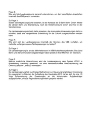 Frage 3: Was wird die Landesregierung generell unternehmen, um den berechtigten Ansprüchen innerhalb des VBB gerecht zu werden. Zu Frage 3: Soweit berechtigte Ansprüche bestehen, ist der Adressat die S-Bahn Berlin GmbH. Weder die Länder Berlin und Brandenburg, noch die Verkehrsverbund GmbH sind hier in der Verantwortung. Die Landesregierung wird sich dafür einsetzen, die strukturellen Voraussetzungen dafür zu schaffen, dass eine vergleichbare Entwicklung für die Zukunft ausgeschlossen werden kann. Frage 4: Wie wird sich die Landesregierung innerhalb der Gremien des VBB verhalten, um maßvolle und angemessene Tarifanpassungen zu leisten? Zu Frage 4: Die Landesregierung ist an das Mehrheitsvotum im VBB-Aufsichtsrat gebunden. Das Land Berlin und die kommunalen Aufgabenträger haben jeweils in ihrer Mehrheit ein Vetorecht. Frage 5: Welche zusätzliche Unterstützung wird die Landesregierung dem System ÖPNV in Brandenburg kurzfristig gewähren, um eine fremdverschuldete Verschlechterung der ÖPNV-Qualität im Lande zu vermeiden? Zu Frage 5: Die Landesregierung hält kurzfristige Maßnahmen zur Steuerung langfristiger Entwicklung für ungeeignet. Im Rahmen der Aufstellung des Haushaltes 2010 hat sie sich für eine 1,5 %ige Dynamisierung der Zuweisungen an die kommunalen Aufgabenträger ausgesprochen, die aus Regionalisierungsmitteln gespeist werden.