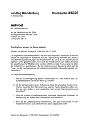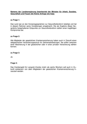 Landtag Brandenburg Drucksache 3/6326 3. Wahlperiode Antwort der Landesregierung auf die Kleine Anfrage Nr. 2364 des Abgeordneten Michael Claus Fraktion der DVU Drucksache 3/6176 Arbeitnehmer werden zur Kasse gebeten Wortlaut der Kleinen Anfrage Nr. 2364 vom 24. 07. 2003: Die sogenannte Gesundheitsreform, die jetzt als Kompromiss vereinbart wurde und bereits im September im Bundesrat auf die Tagesordnung kommen soll, führt zu erneuten Milliardenbelastungen der Arbeitnehmer. So soll z. B. der Zahnersatz aus eigener Tasche gezahlt werden, wenn sich der Arbeitnehmer nicht selber absichert. Die Zuzahlungen für Medikamente werden erhöht und das Krankengeld hat allein der Arbeitnehmer aufzubringen. Bei der Abstimmung im Bundesrat stellt sich die Frage, ob die Landesregierung die arbeitnehmerfeindliche Gesundheitspolitik mit− tragen kann. Ich frage die Landesregierung: 1. Hat die Landesregierung eigene Vorstellungen für eine Reform des Ge− sundheitswesens entwickelt? Wenn ja, welche? 2. Ist die Landesregierung der Auffassung, dass die gesetzlich Krankenversi− cherten zukünftig den Zahnersatz aus eigener Tasche bezahlen sollen, so− fern sie nicht selber in eine gesetzliche oder private Krankenversicherung einzahlen? 3. Sind die privaten Krankenversicherer überhaupt verpflichtet, Patienten zur Absicherung der Kosten des Zahnersatzes aufzunehmen? 4. Kann es die Landesregierung verantworten, dass das Krankengeld von den Arbeitnehmerinnen und Arbeitnehmern allein aufgebracht wird? Datum des Eingangs: 27.08.2003 / Ausgegeben: 01.09.2003