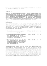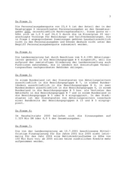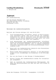 Landtag Brandenburg Drucksache 3/3145 3. Wahlperiode Antwort der Landesregierung auf die Kleine Anfrage 1161 des Abgeordneten Werner Firneburg Fraktion der DVU Drucksache 3/2978 Warnungen des Landesrechnungshofes Wortlaut der Kleinen Anfrage 1161 vom 28.06.2001: 1. Sind Pressemeldungen zutreffend, wonach im Koalitionsver- trag vereinbart wurde, dass 8.000 Stellen von Landesbe- diensteten bis 2005 zu streichen sind, die Regierung aber nunmehr nur die Hälfte abbauen will? Wenn nein, wie viele Stellen werden bis zum Jahre 2005 abgebaut? 2. Sind Berechnungen des Landesrechnungshofes zutreffend, wonach die Personalausgabenquote bereits für das vergangene Jahr fast 30 Prozent ausmacht, weil in anderen Etatposten versteckte Rentenzahlungen und Personalaufwendungen hinzu- zuzählen sind? 3. Warum gibt die Landesregierung lediglich eine Personalaus- gabenquote von 23,4 Prozent an? 4. Warum wurden Abteilungsleiter generell in die Besoldungs- gruppe B 6 mit Grundbezügen von mindestens 12.000 DM einge- stuft? 5. Wie ist die Praxis in den übrigen 15 Bundesländern? 6. Wieviel Prozent des Landeshaushalts werden für Zinszahlun- gen ausgegeben? 7. Gibt es innerhalb der Landesregierung Überlegungen, den Abbau der Neuverschuldung noch über das Jahr 2004 hinaus zu strecken? Datum des Eingangs: 09.08.2001 / Ausgegeben: 14.08.2001