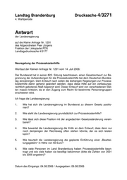 Landtag Brandenburg Drucksache 4/3271 4. Wahlperiode Antwort der Landesregierung auf die Kleine Anfrage Nr. 1291 des Abgeordneten Peer Jürgens Fraktion der Linkspartei.PDS Landtagsdrucksache 4/3177 Neuregelung der Prozesskostenhilfe Wortlaut der Kleinen Anfrage Nr. 1291 vom 14. Juli 2006: Der Bundesrat hat in seiner 822. Sitzung beschlossen, einen Gesetzentwurf zur Be- grenzung der Aufwendungen für die Prozesskostenhilfe bei dem Deutschen Bundes- tag einzubringen. Dem Entwurf nach sollen die bisherigen Regelungen zur Prozess- kostenhilfe dahin gehend geändert werden, dass diese Hilfe auf ein verfassungs- rechtlich gebotenes Maß begrenzt wird. Dieser Entwurf wird von verschiedenen Stel- len massiv kritisiert, da er den Zugang zum Recht für bestimmte Personengruppen erschweren wird. Ich frage die Landesregierung: 1. Wie hat sich die Landesregierung im Bundesrat zu diesem Gesetz positio- niert? 2. Wie steht die Landesregierung grundsätzlich zur Prozesskostenhilfe? 3. Wie lässt sich diese Position mit der angedachten Gesetzesänderung verein- baren? 4. Wie bewertet die Landesregierung die Kritik an dem Entwurf, dass dann nur noch demjenigen der Rechtsweg offen stehen könnte, der es sich leisten kann? 5. Wie beurteilt die Landesregierung die geplante Einführung einer „Bearbei- tungsgebühr“ in Höhe von 50 Euro? 6. Wie viele Personen im Land Brandenburg haben Prozesskostenhilfe bean- tragt und wie viele haben sie bewilligt bekommen (bitte die Zahlen von 2001 bis 2005 angeben)? Datum des Eingangs: 04.08.2006 / Ausgegeben: 09.08.2006