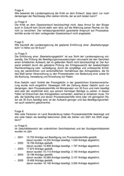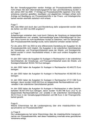 Frage 4: Wie bewertet die Landesregierung die Kritik an dem Entwurf, dass dann nur noch demjenigen der Rechtsweg offen stehen könnte, der es sich leisten kann? zu Frage 4: Die Kritik an dem Gesetzentwurf berücksichtigt nicht, dass Armut für den Bürger auch in Zukunft kein Grund dafür sein wird, auf die Wahrung seiner Rechte vor Ge- richt zu verzichten. Der verfassungsrechtlich garantierte Anspruch auf Prozesskos- tenhilfe wurde mit dem vorliegenden Gesetzentwurf nicht angetastet. Frage 5: Wie beurteilt die Landesregierung die geplante Einführung einer „Bearbeitungsge- bühr“ in Höhe von 50 Euro? zu Frage 5: Die Einführung einer „Bearbeitungsgebühr“ ist aus Sicht der Landesregierung not- wendig. Die Prüfung der Bewilligungsvoraussetzungen verursacht bei den Gerichten einen erheblichen Aufwand, der im geltenden Recht nicht berücksichtigt ist. Der Auf- wand entsteht durch die gebotene Prüfung der Erfolgsaussicht der beabsichtigten Rechtsverfolgung oder -verteidigung, durch die sorgfältige und umfassende Ermitt- lung der persönlichen und wirtschaftlichen Verhältnisse des Antragstellers, die für das Maß seiner Heranziehung zu den Prozesskosten von Bedeutung sind, sowie für die Buchung, Verwaltung und Einziehung von Raten. Eine Gebühr nach Vorbild der Praxisgebühr in der gesetzlichen Krankenversiche- rung wurde nicht eingeführt. Deswegen trifft die Zahlung dieser Gebühr auch nur denjenigen, dem Prozesskostenhilfe mit Monatsraten von 30 Euro und mehr bewilligt wird oder der verpflichtet wird, aus seinem Vermögen Beträge zu zahlen. In diesen Fällen ist Einkommen des Antragstellers vorhanden, welches er einsetzen muss. Für alle, die bedürftig sind und denen Prozesskostenhilfe ohne oder mit geringeren Ra- ten als 30 Euro bewilligt wird, ist der Aufwand geringer und das Bewilligungsverfah- ren auch weiterhin gebührenfrei. Frage 6: Wie viele Personen im Land Brandenburg haben Prozesskostenhilfe beantragt und wie viele haben sie bewilligt bekommen (bitte die Zahlen von 2001 bis 2005 ange- ben)? zu Frage 6: Im Geschäftsbereich der ordentlichen Gerichtsbarkeit und der Sozialgerichtsbarkeit wurden im Jahr • 2001 15.753 Anträge auf Bewilligung von Prozesskostenhilfe gestellt, davon wurden 14.204 Anträge bewilligt, 1.549 Anträge abgelehnt; • 2002 16.706 Anträge gestellt, davon wurden 14.909 Anträge bewilligt, 1.797 Anträge abgelehnt; • 2003 17.873 Anträge gestellt, davon wurden 15.713 Anträge bewilligt, 2.160 Anträge abgelehnt; • 2004 19.196 Anträge gestellt, davon wurden 16.089 Anträge bewilligt, 3.107 Anträge abgelehnt; • 2005 19.406 Anträge gestellt, davon wurden 16.146 Anträge bewilligt, 3.260 Anträge abgelehnt.