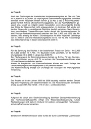 zu Frage 2: Nach den Erfahrungen der dramatischen Hochwasserereignisse an Elbe und Oder ist in jedem Fall zu prüfen, ob ursprüngliche Überschwemmungsgebiete zumindest teilweise wieder hergestellt werden können. § 23 Abs. 2 Satz 2 Wasserhaushalts− gesetz fordert, frühere Überschwemmungsgebiete, die als Rückhalteflächen ge− eignet sind, soweit wie möglich wieder herzustellen, wenn überwiegende Gründe des Wohls der Allgemeinheit nicht entgegenstehen. Im konkreten Fall würde sich darüber hinaus die zu verteidigende Deichlinie deutlich verkürzen. Nach Betrach− tung verschiedener Trassenführungen laufen derzeit die Voruntersuchungen für eine Vorzugs−Rückdeichungstrasse zwischen den Stat. 2,400 und 5,200 des Alt− deiches, etwa entlang der Acker−/ Grünlandgrenze mit einer möglichen Deichlänge von rd. 2000 m und einer Rückdeichungsfläche von rd. 100 ha. Die Trassenlänge des Altdeiches beträgt in diesem Deichabschnitt 2.800 m. zu Frage 3: Für die Sanierung des Deiches in der bestehenden Trasse von Deich − km 2,400 bis 5,200 werden rd. 1.700,− T Baukosten brutto geschätzt, für die Rückdei− chungstrasse mit rd. 2000 m Länge etwa 3.800 T . Der Flächenerwerb der Deichrückverlegung beträgt ca. 8,0 ha. Für den Grunder− werb ist mit Kosten von ca. 40,0 T zu rechnen. Als Planungskosten können etwa 10% der Bausumme kalkuliert werden. Kosten für Ausgleichs− und Ersatzmaßnahmen können erst nach Vorlage des Landschaftspflegerischen Begleitplanes (LBP) benannt werden. Die Kostenschätzung erfolgte auf Grundlage der Aussagen der Planungsphase Vorplanung. zu Frage 4: Das Projekt soll in den Jahren 2005 bis 2008 bauseitig realisiert werden. Derzeit liegt eine Vorplanung zum Gesamtvorhaben vor. Die Finanzierung des Vorhabens erfolgt aus dem HH−Titel 10105 − 715 01 (EU − und Bundesmittel). zu Frage 5: Aufgrund der durch eine Deichrückverlegung bewirkten Querschnittserweiterung des Hochwasserabflussprofils erfolgt eine Wasserstandsreduzierung. Lokale Rückdeichungen sind stets im Verbund mit weiteren vorbeugenden Hochwasser− schutzmaßnahmen zu betrachten. zu Frage 6: Bereits beim Winterhochwasser 2003 wurde der durch austretendes Qualmwasser
