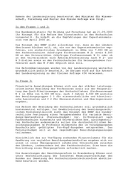 Landtag Brandenburg Drucksache 3/1992 3. Wahlperiode Antwort der Landesregierung auf die Kleine Anfrage Nr. 725 des Abgeordneten Dr. Andreas Trunschke Fraktion der PDS Drucksache 3/1753 Reform des Hochschuldienstrechts Wortlaut der Kleinen Anfrage Nr. 725 vom 29. August 2000: Anfang April legte die Expertenkommission "Reform des Hochschul- dienstrechts" ihre Empfehlungen vor. Die Bundesministerin für Bildung und Forschung, Edelgard Bulmahn, will noch in dieser Legislaturperiode eine Reform des Hochschuldienstrechts in Kraft setzen. Dies wird voraussichtlich erhebliche Auswirkungen auch für die Entwicklung der brandenburgischen Hochschulen haben. Ich frage daher die Landesregierung: 1. Wie beurteilt sie die Empfehlungen der Expertenkommission grundsätzlich? 2. Wie beurteilt sie (auf dem heutigen Stand) insbesondere a) die vorgeschlagene Beibehaltung des Beamtenstatus für Professoren; b) die ansonsten vorgesehene Abschaffung des Beamtensta- tus für Hochschulangehörige; c) die vorgeschlagene Einführung einer Juniorprofessur; d) die vorgeschlagene Abschaffung der Habilitation und e) die Vorschläge für eine stärker leistungsorientierte Besoldung der Professoren? 3. Welche finanziellen Auswirkungen erwartet die Landesregie- rung? 4. Wie wird sich das Land Brandenburg in die weitere Diskus- sion der Reform des Hochschuldienstrechts einbringen? 5. Wie sollen aus Sicht der Landesregierung bei der eigenen Meinungsbildung die brandenburgischen Hochschulen und ande- re mit der Hochschule verbundene Gruppen, z.B. die zustän- digen Gewerkschaften, an dieser Diskussion beteiligt wer- den? Datum des Eingangs: 10.11.2000 / Ausgegeben: 15.11.2000