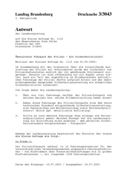 Landtag Brandenburg Drucksache 3/3043 3. Wahlperiode Antwort der Landesregierung auf die Kleine Anfrage Nr. 1112 des Abgeordneten Sven Petke Fraktion der CDU Drucksache 3/2843 Überalteter Fuhrpark der Polizei - Ein Sicherheitsrisiko? Wortlaut der Kleinen Anfrage Nr. 1112 vom 22.05.2000: Im Zusammenhang mit der Diskussion über die hinreichende Aus- stattung der Polizei mit Schutzwesten wurde der Sicherheit von Polizeibediensteten endlich der ihr gebührende Stellenwert ein- geräumt. Dennoch ist dies offenkundig nur ein Aspekt unter vie- len: Auch ein Teil der augenfällig im Straßenverkehr befindli- chen Fahrzeuge der Polizei dürfte aufgrund Alters und der damit einhergehenden mangelnden Sicherheitsausstattung ein erhebliches Sicherheitsrisiko aufweisen: Ich frage daher die Landesregierung: 1. Über wie viel Fahrzeuge verfügt der Polizeifuhrpark und welches Baujahr bzw. welche Kilometerleistung haben diese? 2. Haben diese Fahrzeuge des Polizeifuhrparks eine dem heute technischen Standard entsprechende Sicherheitsausstattung, also Fahrerairbag und Beifahrerairbag sowie Seitenaufprall- schutz? (Bitte ggf. detaillierte Auflistung) 3. Sollte es noch mehrere Fahrzeuge ohne Airbags und Seiten- aufprallschutz geben: Welches Konzept hat die Landesregie- rung zur Einrichtung eines modernen - dem aktuellen Sicher- heitsstandard entsprechenden - Fuhrparks? Namens ns der Landesregierung beantwortet der Minister des Innern n die Kleine Anfrage wie folgt: zu Frage 1: Der Polizeifuhrpark umfasst in 10 Fahrzeugkategorien 50, den unterschiedlichen Verwendungszwecken angepasste Fahrzeugfunktio- nen - von Krafträdern über Funkstreifenkraftwagen bis zu großen Kraftomnibussen -, mit insgesamt 1546 Fahrzeugeinheiten. Datum des Eingangs: 10.07.2001 / Ausgegeben: 16.07.2001