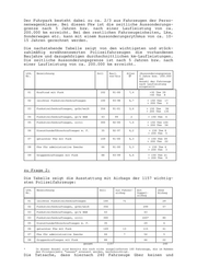 Der Fuhrpark besteht dabei zu ca. 2/3 aus Fahrzeugen der Perso- nenwagenklasse. Bei diesen Pkw ist die zeitliche Aussonderungs- grenze nach 5 Jahren bzw. nach einer Laufleistung von ca. 200.000 km erreicht. Bei den restlichen Fahrzeugeinheiten, Lkw, Sonderwagen etc. kann mit einem Aussonderungsrythmus von ca. 10- 15 Jahren gerechnet werden. Die nachstehende Tabelle zeigt von den wichtigsten und stück- zahlmäßig erwähnenswerten Polizeifahrzeugen die vorhandenen Baujahre und dazugehörigen durchschnittlichen km-Laufleistungen. Die zeitliche Aussonderungsgrenze ist nach 5 Jahren bzw. nach einer Laufleistung von ca. 200.000 km erreicht. Lfd. Bezeichnung Soll Bauj. Alter (Aussonderungsgrenze Nr. von-bis ∅ 5 Jahre bzw. 200.000 km) Anzahl der Fahrzeuge nach Laufleistung eingeteilt 01 Kraftrad mit Funk 102 91-00 7,4 >30 Tkm 39 >40 Tkm 8 02 leichter Funkstreifenkraftwagen 100 93-98 6,7 > 150 Tkm 17 > 200 Tkm 2 03 Funkstreifenkraftwagen, grün/weiß 356 91-01 3,6 > 150 Tkm 94 > 200 Tkm 135 04 Funkstreifenkraftwagen, gr/w BAB 43 99 2 > 150 Tkm 6 05 Funkstreifenkraftwagen, zivil 300 92-00 7,4 > 150 Tkm 104 > 200 Tkm 58 06 Diensthundeführerkraftwagen m. F. 35 92-97 6,2 > 150 Tkm 8 > 200 Tkm 5 07 getarnter Pkw mit Funk 169 91-00 6,3 > 150 Tkm 39 > 200 Tkm 22 08 Pkw für administrative Zwecke 66 91-00 5,3 > 150 Tkm 6 > 200 Tkm 3 09 Gruppenkraftwagen mit Funk 88 93-99 5,6 > 150 Tkm 21 > 200 Tkm 9 zu Frage 2: Die Tabelle zeigt die Ausstattung mit Airbags der 1157 wichtig- sten Polizeifahrzeuge: Lfd. Bezeichnung Soll nur Fahrer- mit ohne Nr. airbag Doppel- Airbag airbag 01 leichter Funkstreifenkraftwagen 100 71 29 02 Funkstreifenkraftwagen, grün/weiß 356 299 57 03 Funkstreifenkraftwagen, gr/w BAB 43 43 03 Funkstreifenkraftwagen, zivil 300 220* 80 05 Diensthundeführerkraftwagen m. F. 35 29 6 06 getarnter Pkw mit Funk 169 13 115 41 07 Pkw für administrative Zwecke 66 7 54 5 08 Gruppenkraftwagen mit Funk 88 66 22 gesamt 1157 240 * In dieser Anzahl sind bereits die noch nicht ausgelieferten 160 Fahrzeuge, die im Rahmen des Pilotprojekts "Leasen" erneuert werden, berücksichtigt. Die Tatsache, dass hiernach 240 Fahrzeuge über keinen und