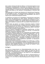 Landtag Brandenburg Drucksache 4/1582 4. Wahlperiode Antwort der Landesregierung auf die Kleine Anfrage Nr. 550 der Abgeordneten Tina Fischer Fraktion der SPD Landtagsdrucksache 4/1413 Klein− und Kleinstunternehmen Wortlaut der Kleinen Anfrage Nr. 550 vom 21. Juni 2005: Die Weiterentwicklung der Industriegesellschaft zu einer Dienstleistungs− und Wis− sensgesellschaft ist hinsichtlich der Entwicklung von Unternehmen durch zwei ge− genläufige Tendenzen gekennzeichnet. Auf der einen Seite fusionieren immer mehr vormals eigenständige Unternehmen zu Großunternehmen. Auf der anderen Seite kommt es verstärkt zur Gründung von Klein− und Kleinstunternehmen. Aufgrund ihrer wirtschaftlichen Bedeutung als Arbeitgeber, Innovator und Ausbilder sind Klein− und Kleinstunternehmen die Basis für die wirtschaftliche Entwicklung einer Region. Während Großunternehmen durch Fusionen immer mehr Kompetenzen anhäufen, diese dann segmentieren und über hierarchisch strukturierte Unterneh− men vernetzen, zeigt sich bei Klein− und Kleinstunternehmen der Trend hin zur Kompetenzspezialisierung und kundenorientierten Vernetzung. Dies muss bei der Förderung Berücksichtigung finden. Ich frage die Landesregierung: 1. Wie viele Arbeitsplätze gibt es bei Klein− und Kleinstunternehmen im Land Brandenburg? 2. Wie hoch ist der Anteil der Arbeitsplätze von Klein− und Kleinstunternehmen im Verhältnis zu den Arbeitsplätzen in allen übrigen Unternehmen (bitte ge− sondert nach Klein− und Kleinstunternehmen aufschlüsseln)? 3. Welche Fördermaßnahmen gibt es für Klein− und Kleinstunternehmen? 4. Inwieweit werden diese von Klein− und Kleinstunternehmen in Anspruch genommen (bitte gesondert nach Klein− und Kleinstunternehmen aufschlüs− seln)? Datum des Eingangs: 19.07.2005 / Ausgegeben: 25.07.2005