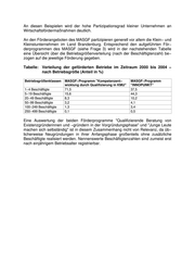 An diesen Beispielen wird der hohe Partizipationsgrad kleiner Unternehmen an Wirtschaftsfördermaßnahmen deutlich. An den Förderangeboten des MASGF partizipieren generell vor allem die Klein− und Kleinstunternehmen im Land Brandenburg. Entsprechend den aufgeführten För− derprogrammen des MASGF (siehe Frage 3) wird in der nachstehenden Tabelle eine Übersicht über die Betriebsgrößenverteilung (nach der Beschäftigtenzahl) be− zogen auf die jeweilige Förderung gegeben. Tabelle: Verteilung der geförderten Betriebe im Zeitraum 2000 bis 2004 − nach Betriebsgröße (Anteil in %) Betriebsgrößenklassen MASGF−Programm "Kompetenzent− MASGF−Programm wicklung durch Qualifizierung in KMU" "INNOPUNKT" 1−4 Beschäftigte 71,5 37,5 5−19 Beschäftigte 15,6 44,3 20−49 Beschäftigte 8,3 10,2 50−99 Beschäftigte 3,2 4,1 100−249 Beschäftigte 1,3 3,4 250−499 Beschäftigte 0,1 0,5 Eine Auswertung der beiden Förderprogramme "Qualifizierende Beratung von Existenzgründerinnen und −gründern in der Vorgründungsphase" und "Junge Leute machen sich selbständig" ist in diesem Zusammenhang nicht von Relevanz, da üb− licherweise Neugründungen in ihrer Anfangsphase großenteils ohne zusätzliche Beschäftigte realisiert werden. Nennenswerte Beschäftigtenzahlen sind zumeist erst nach einjährigem Betriebsalter registrierbar.