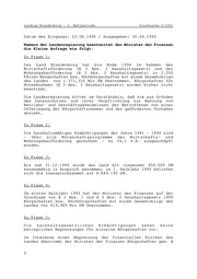 Landtag Brandenburg Drucksache 2/1261 2. Wahlperiode Antwort der Landesregierung auf die Kleine Anfrage Nr. 364 des Abgeordneten Dr. Wolfgang Hackel Fraktion der CDU Drucksache 2/1094 Übernahme von Bürgschaften und Rückbürgschaften durch das Land Wortlaut der Kleinen Anfrage Nr. 364 vom 17.07.1995: Der Minister der Finanzen ist gemäß Haushaltsgesetz 1995, § 3 Absätze 1 und 2 ermächtigt, jeweils Bürgschaften in Höhe bis zu 1 Mrd. DM zu übernehmen. Absatz 3 regelt die Ermächtigung, Bürgschaften im Falle eines unvorhergesehenen und unabweisbaren Bedürfnisses, insbesondere für Notmaßnahmen im Land Brandenburg in Höhe bis zu 100 Mio DM zu übernehmen. In den Vorjahren (teilweise mit Nachtragshaushalt erhöht) lagen die Ansätze für die Ermächtigungsbereiche der Absätze 1 - 3 wesentlich unter dem Rahmen des Haushaltes 1995. Ich frage die Landesregierung: 1. In welcher Höhe wurden Bürgschaften für welche Unternehmen und Projekte in der 1. Wahlperiode übernommen? 2. Wie hoch war dabei der Ausschöpfungsgrad im Verhältnis zum Bürgschaftsrahmen lt. Haushaltsgesetz? 3. Wieviele dieser Bürgschaften sind in der 2. Wahlperiode haushaltsrelevant? 4. Welche Situation stellt sich bei der Bürgschaftsvergabe im 1. Halbjahr 1995 für dieses Haushaltsjahr? 5. Gibt es eine Grenze zur Übernahme von Bürgschaften, bis zu welcher das Land selbst entscheiden kann bzw. wer bürgt mit bei Überschreiten einer möglichen Obergrenze (einschließlich gesetzliche Grundlagen)?
