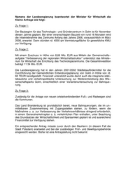 Landtag Brandenburg Drucksache 3/7908 3. Wahlperiode Antwort der Landesregierung auf die Kleine Anfrage Nr. 2949 der Abgeordneten Anita Tack Fraktion der PDS Landtagsdrucksache 3/7858 Innovations− und Gründerzentrum Golm Wortlaut der Kleinen Anfrage Nr. 2949 vom 27.08.2004: Am 23.8.2004 erfolgte durch den Ministerpräsidenten und weitere Mitglieder der Landesregierung, den Landrat Potsdam−Mittelmark, den Potsdamer Oberbürger− meister und Vertreter der Einrichtungen des Wissenschaftsparks der symbolische Spatenstich zur Errichtung des Innovations− und Gründerzentrums am Standort Golm, westlich der Eisenbahntrasse. Um die Errichtung des Innovationszentrums wurde viele Jahre gerungen. Offen− sichtlich ist aber in der bisherigen Planung eine Verkehrsverbindung (Fuß− und Fahrradweg) zwischen Uni Potsdam und dem Standort mehrerer wissenschaftlicher Einrichtungen und künftig auch des Innovations− und Gründerzentrums über die Bahnstrecke am Standort Golm nicht in Betracht gekommen. Diese Verkehrsver− bindung über die Bahn ist aber zur Sicherung einer schnellen Austausches zwi− schen den durch die Bahn getrennten Standorte dringend erforderlich. Ich frage die Landesregierung: 1. Wann ist voraussichtlich Baubeginn am Innovations− und Gründerzentrum und wann soll das Vorhaben in Betrieb genommen werden? 2. Wie hoch ist die Landesförderung für das Vorhaben Golm, aus welchen Mi− nisterien bzw. Förderprogrammen? 3. Welche Art von Unterstützung wird die Landesregierung zur Errichtung der Bahnüberquerung für Fußgänger und Radfahrer geben? Datum des Eingangs: 27.09.2004 / Ausgegeben: 04.10.2004