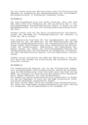 Als ein erster positiver Beitrag hierzu kann die Erstellung des Exposeés zur Vermarktung des Ledigenwohnheimes der Ilse-Bergbau- Aktiengesellschaft in Großräschen angesehen werden. Zu Frage 3: Das Land Brandenburg wird sich dafür einsetzen, dass auch nach dem Jahre 2002 eine Förderung der IBA aus Mitteln des 3. Ver- waltungsabkommens Braunkohlesanierung sowohl in Bezug auf das Managementprojekt als auch die Einzelprojektfinanzierung erfol- gen kann. Darüber hinaus sind auf der Basis projektkonkreter Antragstel- lungen der IBA-GmbH die Fördermöglichkeiten der Ressorts im Sinne der IBA zu prüfen. Eine wesentliche Plattform für die Zusammenarbeit der Landes- regierung mit der IBA GmbH bzw. für den Begleitprozess der IBA durch die Landesregierung stellt die Interministerielle Arbeits- gruppe (IMAG) Fürst-Pückler-Land unter Federführung des Ministe- riums für Landwirtschaft, Umweltschutz und Raumordnung dar. Ebenso werden wie bisher die Einflussnahmemöglichkeiten der Landesregierung über die IBA-Gremien wie Fachbeirat, Projektbei- rat oder IBA-Arbeitskreise genutzt und nach Möglichkeit forciert werden. Darüber hinaus unterstützt das MLUR den IBA-Prozess in der Lau- sitz durch die Vergabe und Finanzierung IBA-relevanter raumord- nerischer Studien. Zu Frage 4: Die Landesregierung bewertet die von der Strategischen Kommis- sion vorgeschlagenen Gestaltungsprinzipien analog der Einschät- zung des IBA-Fachbeirates (hier vertreten durch das MLUR und das MSWV) als Anregung zur Realisierung des wesentlichen übergeord- neten Themas "Werkstatt für neue Landschaften". Der endgültige Gestaltungsvorschlag wird insbesondere im Ergeb- nis des für September 01 durch die IBA GmbH inszenierten inter- nationalen Workshops ausgearbeitet werden. Das Land leistet dabei durch die Vergabe einer Machbarkeitsstu- die durch die Gemeinsame Landesplanungsabteilung einen Beitrag zur Landmarken- und Alleeproblematik bis Dezember 01.