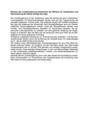 Landtag Brandenburg Drucksache 4/599 4. Wahlperiode Antwort der Landesregierung auf die Kleine Anfrage 192 des Abgeordneten Sigmar−Peter Schuldt Fraktion der DVU Drs. 4/444 Wortlaut der Kleinen Anfrage: Pkw−Maut in Deutschland Derzeit wird in Politik und Medien zunehmend die Einführung einer Autobahnbe− nutzungsgebühr für Personenkraftfahrzeuge zur Erzielung zusätzlicher Einnahmen zur Finanzierung des Bundes−Autobahn−Netzes sowie als umweltpolitisches Steuerungselement diskutiert. Ich frage die Landesregierung: Wie ist die Position der Landesregierung zur Einführung einer Autobahnmaut für Personenkraftfahrzeuge in Deutschland, insbesondere im Hinblick auf deren a) umweltpolitische Lenkungseffekte und/oder b) haushaltspolitische Gesichtspunkte? (Bitte detaillierte Darlegung bei Abwägung aller steuer−, umwelt− und rechtspoliti− schen Kriterien!) Datum des Eingangs: 07.02.2005 / Ausgegeben: 14.02.2005