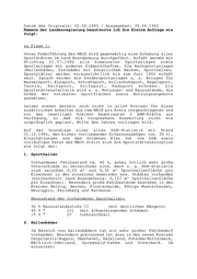 Tabelle 1 - Hallenbäder (Bestand in ausgewählten Kreisen) Neuer Kreis Alter Kreis Hallenbad vorhanden 16 2/3 m Beckenlänge 16 2/3 m Beckenlänge (Lehrschwimmbecken ) Uckermark Prenzlau - - Angermünde - 1 Templin 1 - Schwedt - 1 1 Prignitz Perleberg - - Pritzwalk - 1 Ostprignitz-Ruppin Kyritz - - Neuruppin 1 - Wittstock 1 - Oberhavel Bernau - - Eberswalde 1 - Havelland Nauen - - Rathenow 1 - Potsdam-Mittelmark Belzig - - Brandenburg-Land - - 2 Potsdam-Land - - Märkisch-Oderland Bad Freienwalde - - Strausberg 1 - Seelow - - Spreewald-Dahme Königs Wusterhausen 2 1 Luckau - - Lübben - - Bauzustand der vorhandenen Hallenbäder: 30 % Bauzustandsstufe II 45 % " III Es sind insbesondere Sanierungen zur Reduzierung der laufenden Betriebs- und Unterhaltungskosten (Heizung, Sanitär), zur Einhaltung von hygienischen Mindestanforderungen sowie zur Beseitigung von gravierenden Mängeln im Sanitärbereich notwendig. 3. Sportplätze 1 Bundesvermögen - Bundeswehr, Nutzung durch Kommunen nicht zugelassen 2 Bundesvermögen - Bundeswehr, seit 2 Jahren keine Nutzung