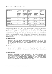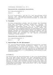 Tabelle 2 - Goldener Plan West Bedarfsbereich I. Fassung I. Fassung II. Fassung III. Fassung 1956 1959 1967 1976 Gemeinden Gemeinden Gemeinden Gemeinden alle mit 5 000 bis zu 5 000 mit 5 000 mit bis zu Gemeinden und mehr Einw. und mehr 5 000 Einw. Einw. Einw. m²/E m²/E m²/E m²/E m²/E Sporthallen 0,1 0,1 - 0,2 0,1 0,1 - 0,2 0,2 - 0,4 Hallenbäder 0,007 0,007 0,008 0,008 0,01 - 0,25 Sportplätze 3 3,2 - 8,5 3,5 3,2 - 8,5 4 Freibäder mit 0,1 0,1 - 0,2 0,1 - 0,2 0,1 - 0,2 0,05 - 0,15 künstlichen Becken Sondersportanlagen je nach örtlichem Bedarf Im Goldenen Plan Ost, der vom DSB am 28.11.1992 beschlossen wurde, geht man in der "Richtlinie für die Schaffung von Erholungs-, Spiel- und Sportanlagen in den neuen Bundesländern" (Richtlinien) davon aus, daß in absehbarer Zeit eine den alten Bundesländern vergleichbare Sportentwicklung eintreten wird. Es sind Orientierungswerte für den Bedarf an nutzbarer Sportfläche in Abhängigkeit von Siedlungsstruktur und Einwohnerzahl ausgewiesen. 1. Sporthallen Nutzbare Hallenfläche pro Einwohner zwischen 0,37 m² für Städte und Gemeinden mit 10 000 und weniger Einwohnern und 0,265 m² pro Einwohner für Städte mit 500 000 und mehr Einwohnern. 2. Hallenbäder Nutzbare Wasserfläche zwischen 0,023 m² pro Einwohner für Städte mit etwa 20 000 Einwohnern und 0,01 m² pro Einwohner für Städte von 100 000 und mehr Einwohnern. 3. Sportplätze Nutzbare Sportplatzfläche zwischen 8,5 m² pro Einwohner für Versorgungsbereiche oder Gemeinden mit etwa 1 000 Einwohnern und 2,5 m² pro Einwohnern für Städte mit 500 000 und mehr Einwohnern. In diesen Bedarfswerten ist die nutzbare Tennisplatzfläche pro Einwohner enthalten. 4. Freibäder mit künstlichen Becken