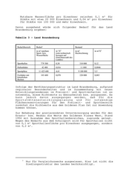 Nutzbare Wasserfläche pro Einwohner zwischen 0,1 m² für Städte mit etwa 20 000 Einwohnern und 0,04 m² pro Einwohner für Städte von 100 000 und mehr Einwohnern. Davon ausgehend würde sich folgender Bedarf für das Land Brandenburg ergeben: Tabelle 3 - Land Brandenburg Bedarfsbereich Bedarf Bestand 3 1 in m² nutzbare in ²/E in m² in m²/E Sport- bzw. (rein rechnerisch Hochrechnung Wasserfläche bezogen auf Einwohnerzahl des Landes) Sporthallen 779 500 0,30 310 000 0,12 Hallenbäder 42 400 0,016 11 800 0,0046 Sportplätze 11 425 600 4,41 9 100 000 3,5 Freibäder mit 183 600 0,070 220 000 0,085 künstlichen Becken Infolge der Bevölkerungsstruktur im Land Brandenburg, aufgrund regionaler Besonderheiten und im Zusammenhang mit neuen Entwicklungstendenzen im Freizeit- und Sportverhalten ist es notwendig, diese Richtwerte zu überarbeiten bzw. anzupassen. Es kann jedoch davon ausgegangen werden, daß für die Sportstättenentwicklungsplanung und für notwendige Flächenreservierungen für den Freizeit- und Sportbereich zunächst die Richtwerte aus dem Goldenen Plan Ost zur Anwendung kommen können. Zur Behebung der gravierendsten Unterversorgung werden für den Ersatz- bzw. Neubau die Werte des Goldenen Planes West, Stand 1956 mit Ausnahme des Sporthallenbereiches, zugrunde gelegt. Wegen des Bedarfs aus dem Schulsport wird für Sporthallen nicht von 0,1 m² Sporthallenfläche pro Einwohner ausgegangen, sondern von 0,2 m². 3 Nur für Vergleichszwecke ausgewiesen. Hier ist nicht die Siedlungsstruktur des Landes berücksichtigt.
