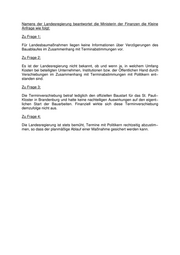 Landtag Brandenburg Drucksache 3/6915 3. Wahlperiode Antwort der Landesregierung auf die Kleine Anfrage Nr. 2554 des Abgeordneten Sigmar−Peter Schuldt Fraktion der DVU Drucksache 3/6663 Teure Terminprobleme Presseberichten zufolge musste der für den 17. November geplante Start für den Umbau des St.−Pauli−Klosters in Brandenburg zum Archäologischen Landesmu− seum auf Anfang Dezember verschoben werden. Der Sprecher des Minsteriums für Wissenschaft, Forschung und Kultur begründete diese Verschiebung mit Schwie− rigkeiten, einen Termin für alle an dem Festakt beteiligten Politiker zu finden. Ich frage die Landesregierung: 1. Wie oft mussten in Brandenburg seit 1999 Baumaßnahmen und andere Aktivitä− ten verschoben werden, weil sich die für den geplanten Beginn als Gäste vorge− sehenen Politiker nicht auf einen Termin einigen konnten, keinen Termin finden konnten oder zu den zugesagten Terminen nicht erschienen (Bitte detaillierte Aufschlüsselung nach Kalenderjahren und Projekten)? 2. Wie hoch waren die Kosten, die den beteiligten Unternehmen, Institutionen bzw. der Öffentlichen Hand durch solche Verschiebungen entstanden (Bitte detaillierte Aufschlüsselung)? 3. Bei wem liegt nach Erkenntnissen der Landesregierung die Verantwortung für den vorliegenden Fall in der Stadt Brandenburg? 4. Welche Konsequenzen zieht die Landesregierung aus solchen Vorfällen? Datum des Eingangs: 07.01.2004 / Ausgegeben: 12.01.2004