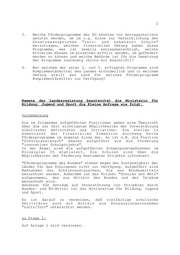 Seite 2 zu Anlage 1: Nr. Programm finanz. Antragsbe- Förderkriterien Umsetzung Ausstattung '97 rechtigt 7 Video-Wettbewerb Preise aus Mitteln Schulen Kreative Medienpädagogisches "Make a Video" des ORB Auseinandersetzung Zentrum, mit den Ostdeutscher Möglichkeiten des Rundfunk Brandenburg Mediums Video