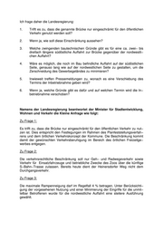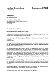 Landtag Brandenburg Drucksache 3/7832 3. Wahlperiode Antwort der Landesregierung auf die Kleine Anfrage 2902 des Abgeordneten Klaus−Jürgen Warnick, Fraktion der PDS, Drs. 3/7761 Wortlaut der Kleinen Anfrage: Neubau der S−Bahn Strecke nach Teltow Im Zuge des Neubaus der S−Bahn Anbindung nach Teltow (Verlängerung der S 25) müssen auch mehrere Brücken errichtet werden. Dazu gehört auch die Errichtung einer Brücke im Verlauf des Heinersdorfer Weges in Teltow. (siehe Skizze) Die lange Anfahrtstraße auf der südöstlichen Seite der Brücke zerschneidet dabei ein seit langem bestehendes Koppelgelände eines örtlichen Gewerbetreibenden (Kleintierzoo und Pferdehaltung). Die Notwendigkeit einer sehr langen, flachen und gewundenen Auffahrt zur Brücke wurde gegenüber den Bürgern mit dem Hinweis auf entsprechende DIN−Normen und der möglichen Benutzung durch Rollstuhlfahrer begründet. Dabei soll die Nut− zung generell nur eingeschränkt möglich sein. Die Brücke soll nicht generell für den öffentlichen Verkehr freigegeben werden, sondern vor allem für den Einsatz von Feuerwehr, Notarztwagen bei Havariefällen geplant sein. Darüber hinaus soll die Überquerung auch Fußgängern, Radfahrern, Rollstuhlfahrern und Reitern etc. möglich sein. Verwunderung löste bei den Bürgern aber die Tatsache aus, dass die Trasse auf der nordwestlichen Seite der Brücke wesentlich kürzer ansteigt, so dass der Hinweis auf bestehende DIN−Normen beim Bau der südöstlichen Auffahrt nicht stichhaltig erscheint. Des Weiteren wurde in den Medien über eine Verzögerung der ursprünglich ge− planten Inbetriebnahme im Dezember diesen Jahres berichtet. Datum des Eingangs: 13.08.2004 / Ausgegeben: 23.08.2004
