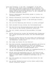 Datum des Eingangs: 17.06.1997 / Ausgegeben: 23.06.1997 8. Gibt es in den bisher durch die Ämter in Cottbus und Schlieben genutzten Liegenschaften Räumlichkeiten, die durch andere Einrichtungen genutzt bzw. die nicht genutzt werden und wie groß ist deren Anteil zu der insgesamt zur Verfügung stehenden Fläche? 9. Wieviel Quadratmeter Bürofläche werden in Luckau zur Verfügung stehen? 10. Wieviel Mitarbeiter sind bisher in beiden Ämtern tätig? 11. Wieviel Mitarbeiter sollen in dem künftigen Standort Luckau tätig sein? 12. Wie wird die Besetzung der Stellen in Luckau erfolgen? 13. Nach welchem Prinzip erfolgt die Stellenbesetzung? 14. Wie hoch wird die Personalreduzierung durch den Umzug nach Luckau an den beiden Standorten ausfallen? 15. Wie soll dieser eventuelle Personalabbau vollzogen werden? 16. Welche Alternativen wurden den Beschäftigten aufgezeigt bzw. welche Alternativen bieten sich den Beschäftigten vor Ort? 17. Wie hoch würden künftig die zeitlichen und finanziellen Aufwendungen für Fahrten zwischen Cottbus und Schlieben und Arbeitsort Luckau sein? 18. Wer trägt die Kosten für die Fahrten? 19. Wie hoch wird der voraussichtliche absolute und relative Lohnverlust für die Mitarbeiter durch die höheren Fahrtkosten zum Arbeitsort Luckau in den verschiedenen für das Amt typischen Einkommensgruppen sein? 20. Ist es zutreffend, daß die Nähe zur Landesgartenschau in Luckau die Begründung für den Umzug ist? 21. Welche sachliche Begründung gibt es, die fachlich gut funktionierenden Agrarordnungsämter durch einen solchen Umzug in ihrer Arbeit wiederum zu behindern und zu lähmen? 22. Wie hoch werden die voraussichtlichen Kosten für den Umzug sein? 23. Aus welchen Haushaltstiteln sollen diese zusätzlichen Kosten finanziert werden?