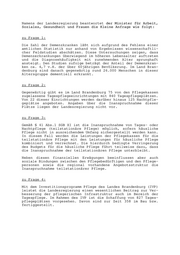 Landtag Brandenburg Drucksache 3/910 3. Wahlperiode Antwort der Landesregierung auf die Kleine Anfrage Nr. 301 der Abgeordneten Kerstin Bednarsky Fraktion der PDS Landtagsdrucksache 3/719 Förderung derung der Tagespflege für demenzkranke Mitbürgerinnen und d Mitbürger Wortlaut der Kleinen Anfrage Nr. 301 vom 02.03.2000: Für Demenzkranke, die zu Hause gepflegt werden, und ihre pfle- genden Angehörigen sind Tagespflegeeinrichtungen von großer Bedeutung. Für den Pflegebedürftigen bedeutet die Tagespflege durch ihre aktivierenden und rehabilitativen Elemente ein Mehr an Lebensqualität. Für die Angehörigen bietet die Tagespflege eine dringend notwendige Entlastung. Ich frage die Landesregierung 1. Wie viele demenzkranke Mitbürgerinnen und Mitbürger gibt es im Land Brandenburg? 2. In welchem Umfang wird in Brandenburg Tagespflege als eine Möglichkeit zur Ergänzung der häuslichen Pflege in Anspruch genommen? 3. Sind aus Sicht der Landesregierung finanzielle Erwägungen ausschlaggebend für die Inanspruchnahme bzw. Nichtinan- spruchnahme von Tages- und Nachtpflege? 4. Welche Möglichkeiten sieht die Landesregierung für eine gezielte Verbesserung des Leistungsangebotes im Bereich der Tages- und Nachtpflege? Datum des Eingangs: 05.04.2000 / Ausgegeben: 10.04.2000