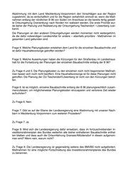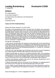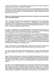 Landtag Brandenburg Drucksache 5/2269 5. Wahlperiode Antwort der Landesregierung auf die Kleine Anfrage 871 der Abgeordneten Henry Wichmann und Frank Bommert CDU-Fraktion Drucksache 5/2138 Ausbau der B 96 in Nordbrandenburg Wortlaut der Kleinen Anfrage 871 vom 08.10.2010: Der Ausbau der Bundesstraße 96 nördlich von Berlin hat für die Region eine herausragen- de Bedeutung. Leider konnte bisher nur im Jahr 2003 die Ortsumfahrung Oranienburg fer- tig gestellt werden. Seitdem warten die Bürger und eine Vielzahl von Wirtschaftsunterneh- men in Brandenburgs Norden darauf, dass auch die weiteren Bauabschnitte bis zur Lan- desgrenze verbindlich angegangen werden. In der Antwort auf die Kleine Anfrage Nr. 498 des Abgeordneten Thomas Günther erklärt die Landesregierung, dass wegen der Kompli- ziertheit der Maßnahme der Richtlinienentwurf für den weiteren Bauabschnitt nördlich von Oranienburg überarbeitet werden müsste und die Einleitung des Planfeststellungsverfah- rens im I. Quartal 2011 angestrebt werde. Ich frage die Landesregierung: 1. Wie lautet der aktuelle Stand aller geplanten Ausbauabschnitte ab der Ortsumfahrung Oranienburg entlang der B 96 bis zur Landesgrenze nach Mecklenburg-Vorpommern? Wie ist der Stand bei der Überarbeitung des Richtlinienentwurfs für den Abschnitt nördlich von Oranienburg? Wird das Ziel, das Planfeststellungsverfahren im I. Quartal 2011 einzuleiten, eingehalten werden können? 2. Bis wann kann nach derzeitiger Lage mit Baurecht und bis wann mit einer Fertigstellung der einzelnen geplanten Bauabschnitte entlang der B 96 gerechnet werden? 3. Welche Gründe liegen vor, dass die im Investitionsrahmenplan 2006 – 2010 enthaltenen Ausbaumaßnahmen OU Teschendorf/Löwenberg und die bereits seit 2004 linienbestimmte OU Fürstenberg im Zeitraum der Gültigkeit dieses Planes nicht einmal begonnen werden konnten? Wie wurden die vom Bund diesbezüglich bereitgestellten Mittel eingesetzt? 4. Welche Planungskosten entstehen dem Land für die einzelnen Bauabschnitte und ist dafür Haushaltsvorsorge getroffen worden? 5. Welche Auswirkungen haben die Kürzungen für den Straßenbau im Landeshaushalt für die Fortsetzung der Planungen der einzelnen Bauabschnitte entlang der B 96? 6. Ist es möglich, einzelne Bauabschnitte entlang der B 96 planungsrechtlich zusammen- zufassen, um möglicherweise Planungskosten einzusparen und verlorene Zeit wieder auf- zuholen? Datum des Eingangs: 01.11.2010 / Ausgegeben: 08.11.2010