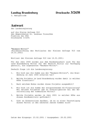 Landtag Brandenburg Drucksache 3/2438 3. Wahlperiode Antwort der Landesregierung auf die Kleine Anfrage 910 des Abgeordneten Dr. Andreas Trunschke Fraktion der PDS Drucksache 3/2291 "Naumann-Mittel" (Kurzbezeichnung des Wortlautes der Kleinen Anfrage 910 vom 16.01.2001) Wortlaut der Kleinen Anfrage 910 vom 16.01.2001: Für das Jahr 2000 wurden aus dem Bundeshaushalt auch für das Land Brandenburg Mittel für den Bereich Kultur zur Verfügung gestellt, die sogenannten "Naumann-Mittel". Deshalb frage ich die Landesregierung: 1. Wie hoch war die Summe aus den "Naumann-Mitteln", die Bran- denburg im Jahr 2000 erhalten hat? 2. Welche Projekte im Land Brandenburg wurden damit in welcher Höhe finanziert? 3. Nach welchem Modus wurden diese Projekte ausgewählt? 4. Wie hoch ist die Summe der entsprechenden Ko-Finanzierung? Bei welchen Projekten gab es Schwierigkeiten bei der Be- reitstellung der kommunalen Mittel? 5. Welche Projekte werden im Jahr 2001 in welcher Höhe aus diesen Bundesmitteln gefördert? 6. Gibt es Erkenntnisse darüber, ob es zu einer Verstetigung dieser Mittel in den nächsten Jahren kommen wird? Datum des Eingangs: 23.02.2001 / Ausgegeben: 28.02.2001