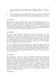 3 ausstellung Berlin-Brandenburg "Preußen 2001"; Investi- tionsvolumen 0,8 Mio. DM, davon Bundesförderung 0,4 Mio. DM. h) Erweiterung des Schulmuseums Reckahn um eine Ausstellung zur brandenburgisch-preußischen Schulgeschichte; Investi- tionsvolumen 1,0 Mio. DM, davon Bundesförderung 0,5 Mio DM. zu Frage 3: Das Ministerium für Wissenschaft, Forschung und Kultur legt der Behörde des Beauftragten des Bundes für Angelegenheiten der Kultur und der Medien für jede einzelne Jahrestranche des Pro- gramms konkrete Projektvorschläge vor, die für eine Förderung aus diesem Programm in Frage kommen könnten. Die Projektauswahl findet dann einvernehmlich im Rahmen von Abstimmungsgesprächen zwischen Bundes- und Landesvertretern statt. zu Frage 4: Zu Ihrer Frage bezüglich der Höhe der Ko-Finanzierung ist fest- zuhalten, dass diese in derselben Höhe zu erbringen ist wie Bundesmittel zum Einsatz kommen sollen; d.h. der Finanzierungs- schlüssel für alle Projekte beträgt grundsätzlich 50 % Bund und 50 % andere Quellen. Seitens des Bundes wird der Anteil von 50 % als Obergrenze gesehen; was bedeutet, dass bei solchen Projek- ten, bei denen der Fehlbedarf geringer ist als 50 %, der Bundes- anteil niedriger als 50 % sein kann. Zu Ihrer Frage nach den Projekten, bei denen es Schwierigkeiten bei der Bereitstellung der kommunalen Anteile gegeben hat, ist erstens grundsätzlich feststellen, dass gegenüber dem Bund ohne- hin nur solche Projekte für eine Förderung vorgeschlagen werden, bei denen die Gesamtfinanzierung gesichert erscheint. Und zwei- tens sind nicht in allen Projekten der "Liste 2" kommunale An- teile enthalten. zu Frage 5: Die sogenannte "Liste 3", die die brandenburgischen Projekte für die Förderung aus dem Programm "Kultur in den neuen Ländern" enthält, tritt erst nach der Unterzeichnung durch den Beauftrag- ten der Bundesregierung für Angelegenheiten der Kultur und der Medien und durch die Ministerin für Wissenschaft, Forschung und Kultur des Landes Brandenburg in Kraft. Da dies erst in den kommenden Wochen terminiert wird, wäre eine Benennung der ein- zelnen Projekte zum jetzigen Zeitpunkt verfrüht. Hingegen steht bereits jetzt fest, dass mit dem Inkrafttreten der "Liste 3" dem Land Brandenburg weitere 5,5 Mio. DM an Bundesmitteln für Pro- jekte im Rahmen des Programms "Kultur in den neuen Ländern" zur Verfügung stehen werden. zu Frage 6: