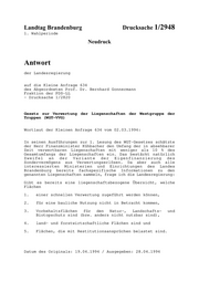 Landtag Brandenburg Drucksache 1/2948 1. Wahlperiode Neudruck Antwort der Landesregierung auf die Kleine Anfrage 634 des Abgeordneten Prof. Dr. Bernhard Gonnermann Fraktion der PDS-LL - Drucksache 1/2820 Gesetz zur Verwertung der Liegenschaften der Westgruppe der Truppen (WGT-VVG) Wortlaut der Kleinen Anfrage 634 vom 02.03.1994: In seinen Ausführungen zur 1. Lesung des WGT-Gesetzes schätzte der Herr Finanzminister Kühbacher den Umfang der in absehbarer Zeit verwertbaren Liegenschaften mit weniger als 10 % des Gesamtumfangs der Liegenschaften ein. Das bestärkt natürlich Zweifel an der Variante der Eigenfinanzierung des Sondervermögens aus Verwertungserlösen. Da aber auch alle interessierten Ministerien und Einrichtungen des Landes Brandenburg bereits fachspezifische Informationen zu den genannten Liegenschaften sammeln, frage ich die Landesregierung: Gibt es bereits eine liegenschaftsbezogene Übersicht, welche Flächen 1. einer schnellen Verwertung zugeführt werden können, 2. für eine bauliche Nutzung nicht in Betracht kommen, 3. Vorbehaltsflächen für den Natur-, Landschafts- und Biotopschutz sind (bzw. anders nicht nutzbar sind), 4. land- und forstwirtschaftliche Flächen sind und 5. Flächen, die mit Restitutionsansprüchen belastet sind. Datum des Originals: 19.04.1994 / Ausgegeben: 28.04.1994
