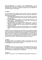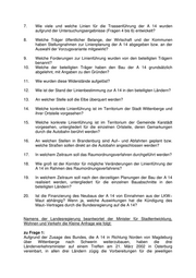Landtag Brandenburg Drucksache 3/7269 3. Wahlperiode Antwort der Landesregierung auf die Kleine Anfrage Nr. 2690 des Abgeordneten Rainer Neumann Fraktion der CDU Drucksache 3/7127 Wortlaut der Kleinen Anfrage A 14 Mit dem Planungsfortschritt für die A 14 Magdeburg − Wittenberge − Ludwigslust wachsen auch die Bedürfnisse der Bevölkerung in den betroffenen Regionen nach konkreten Informationen über den genauen Trassenverlauf, geplante Anschluss− stellen, Baubeginn u.a.m. Ich frage die Landesregierung: 1. Wann wurde mit den Planungen zum Neubau der A 14 zwischen Magdeburg und der A 24 bei Ludwigslust begonnen? 2. In welcher Weise wurde die Zusammenarbeit der beteiligten Länder Sachsen−Anhalt, Mecklenburg−Vorpommern und Brandenburg organisiert? 3. Wie beurteilt die Landesregierung die Zusammenarbeit mit den beteiligten Ländern und dem Bund beim Projekt A 14? 4. Welche Ergebnisse erbrachte die Verkehrsuntersuchung zur A 14 in den beteiligten Ländern, untergliedert nach den Bewertungskriterien Verkehr, Raumordnung und Städtebau? 5. Welche Ergebnisse erbrachte die Umweltverträglichkeitsuntersuchung zur A 14 in den beteiligten Ländern? 6. Welche Konflikte wurden im Ergebnis der Raumwiderstandsanalyse zur A 14 in den beteiligten Ländern jeweils ermittelt? Datum des Eingangs: 30.03.2004 / Ausgegeben: 05.04.2004