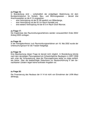 zu Frage 9: Es gab nur von einer Seite (Stadt Perleberg) die konkrete Forderung, die A 14 möglichst nahe der Stadt Perleberg zu führen, um eine möglichst hohe verkehrliche Wirkung für diese zu erzielen. Darüber hinaus wiesen die einzelnen Träger öffentli− cher Belange auf ggf. zu berücksichtigende Konflikte und Bestände hin und trugen so zur Erarbeitung einer Vorzugslösung direkt und indirekt bei. zu Frage 10: Keine. zu Frage 11: Es waren bisher keine Widerstände aufzulösen. zu Frage 12: Am 5. April 2004 werden die in den Ländern planenden Ämter die fertiggestellten Unterlagen für das Raumordnungsverfahren den Verkehrsministern der drei Länder in einem gemeinsamen öffentlichen Termin übergeben. Nach diesem Termin wer− den die fertigen Unterlagen dann in einem nächsten Schritt den jeweiligen Raum− ordnungsbehörden zur Eröffnung und Durchführung der Raumordnungsverfahren übergeben. zu Frage 13: Die A 14 soll im Bereich der Elbequerung westlich von Wittenberge in enger Bün− delung mit der Brücke der vorhandenen B 189 geführt werden. Konkrete Übergangspunkte sind nicht Bestandteil des Raumordnungs− und Lini− enbestimmungsverfahrens, sondern des anschließenden Richtlinienentwurfes als Grundlage für das Planfeststellungsverfahren. zu Frage 14 und 15: Die Vorzugsvariante der A 14 soll von der Landesgrenze Sachsen− Anhalt/Brandenburg kommend parallel zur B 189 westlich und stadtnah zu Wittenberge verlaufen. Die Trasse soll weiter Richtung Norden führen, die B 195 queren, Lindenberg westlich umgehen und zwischen Motrich und Bentwisch hindurch führen. Sie soll in ihrem weiteren Verlauf im Sinne der Trassenbündelung westlich der Bahnlinie "Berlin−Hamburg" nach Norden führen und die bahnnahen Siedlungen Dergenthin und "Siedlung an der Bahn" umgehen. Im weiteren Verlauf soll sie die Gemeinde Karstädt südwestlich umgehen und − nach Nordwesten abschwenkend − in enger Parallellage zur B 5 verlaufen. Südlich von Groß Warnow soll die Vorzugsvariante dann nach Westen abschwenken und an die Vorzugsvariante in MV anbinden. Im Übrigen wird auf die Ausführungen zu Frage 13 verwiesen.