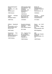 Westmecklenburgische HGW HanseGas GmbH DB Netz AG Energie− Geschäftsbereich Gas− Niederlassung Ost versorgung AG (WE− versorgung Immobilienmanagement MAG) Technisches Büro − N−O−F 4 Obotritenring 40 Rohrnetztechnik Granitzstraße 55 − 56 Jägersteg 2 19053 Schwerin 13189 Berlin 18246 Bützow Prignitzer Eisenbahn DB Telematik GmbH Vattenfall Europe GmbH Region Nord−Ost Transmission GmbH Pritzwalker Straße 2 Attilastraße 61−67 Chausseestraße 23 16949 Putlitz 12105 Berlin 10115 Berlin GDMcom Gesellschaft Eisenbahn−Bundesamt Wasser− und Schiff− für Sachbereich 1, Außen− fahrtsamt Dokumentation und Te− stelle Halle des Bundes − Magde− lekommunikation mbH Ernst−Kamieth−Straße 5 burg PSF 24 12 63 Fürstenwallstraße 19/20 06112 Halle 04332 Leipzig 39016 Magdeburg Westprignitzer Trink− PVU − Prignitzer Ener− EMB wasser− und gie− und Wasser− Erdgas Mark Branden− Abwasserzweckverband versorgungsunterneh− burg GmbH Bahnhofsvorplatz 8 men GmbH Großbeerenstraße 181− Feldstraße 27a 183 19348 Perleberg 19348 Perleberg 14482 Potsdam